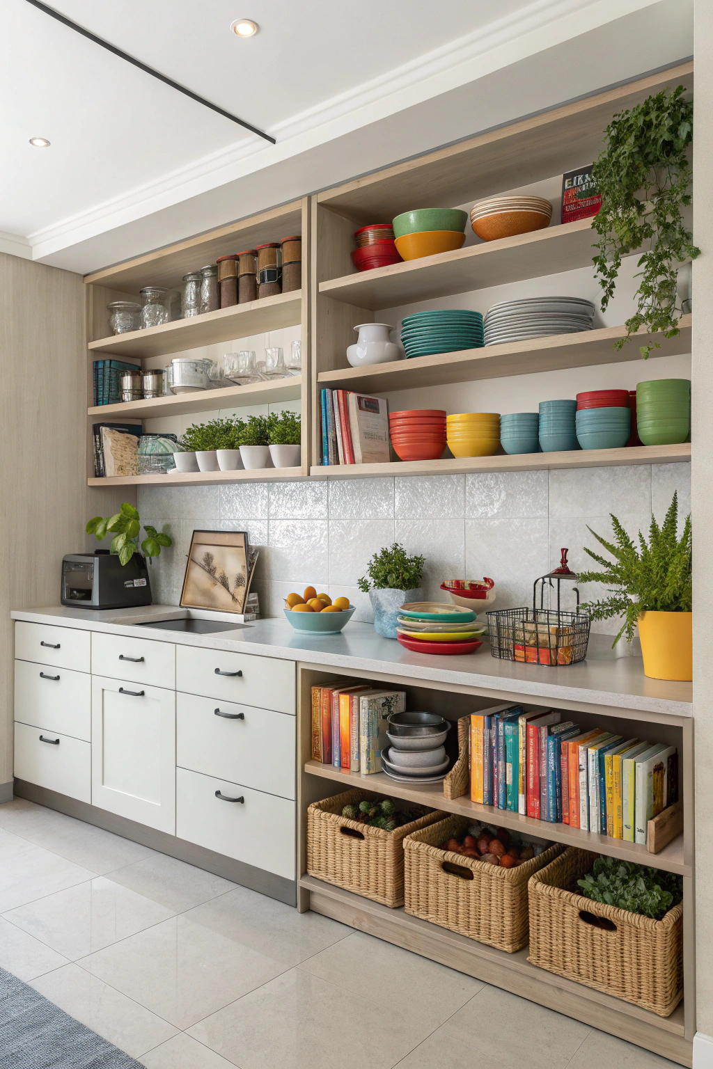 PinMulti-functional furniture paves the way for other smart design choices, such as open shelving solutions. You can showcase your favorite dishes, plants, or cookbooks, adding personality to your kitchen. Plus, open shelves create an illusion of more space. Just remember to keep them organized, and avoid overcrowding. This way, you'll maintain a clean, inviting look while maximizing functionality.