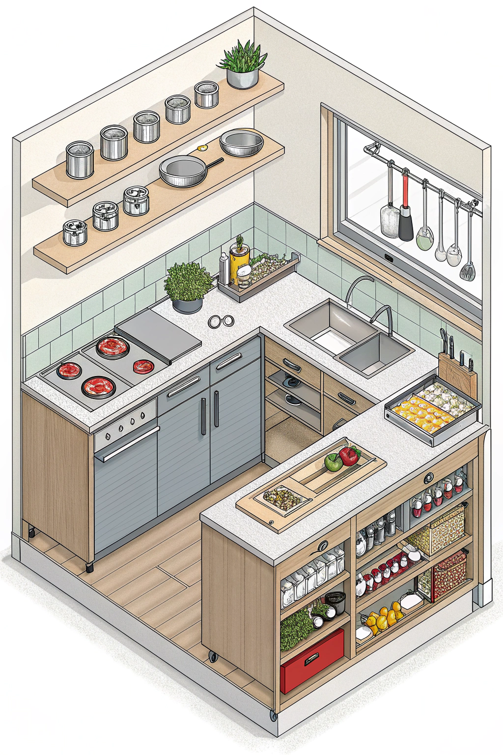 - A cooking zone with easy access to pots and pans