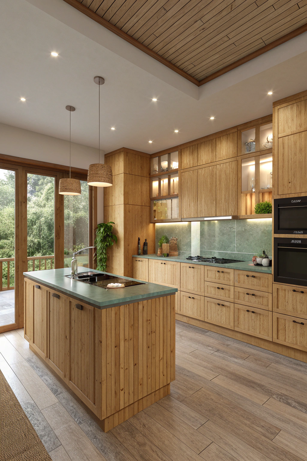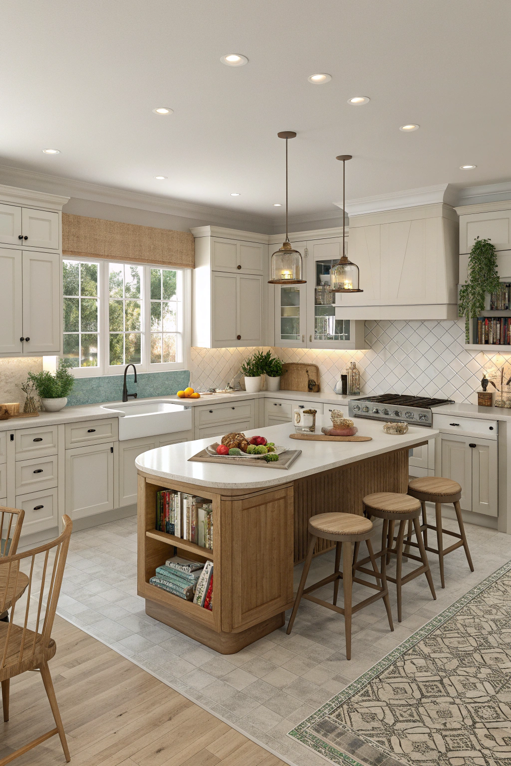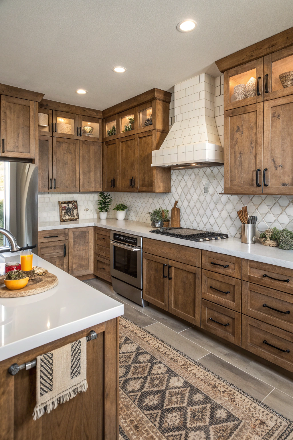 These features create a warm, functional environment for cooking and entertaining.