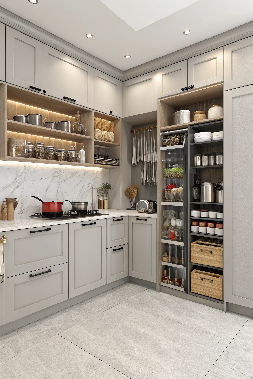 - Pull-out pantry shelves for easy access