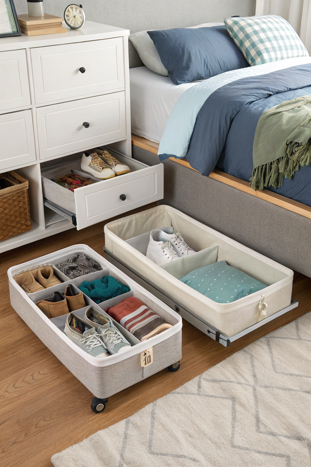 PinUnder-bed storage can be a game-changer for small bedrooms. You can maximize your space by using bins, drawers, or even rolling carts tucked beneath your bed. Consider storing seasonal clothing, shoes, or extra linens. Don't forget to choose options that slide easily out for quick access. By incorporating under-bed storage, you'll keep your room organized and create a more spacious feel.
