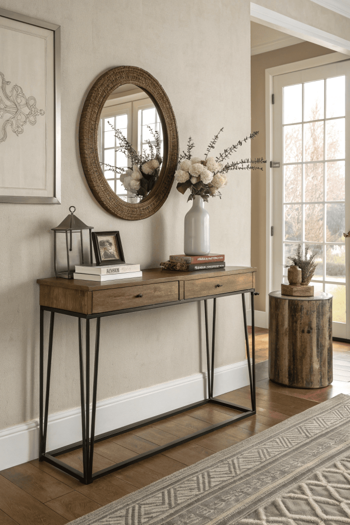 A console table can be a game-changer for your entryway, providing both style and functionality. It offers a place to drop your keys or mail while adding a touch of decor. Choose one that complements your theme, whether it's modern, rustic, or classic. Position it against a wall or between doorways for the best impact, and enhance it with decor items.
