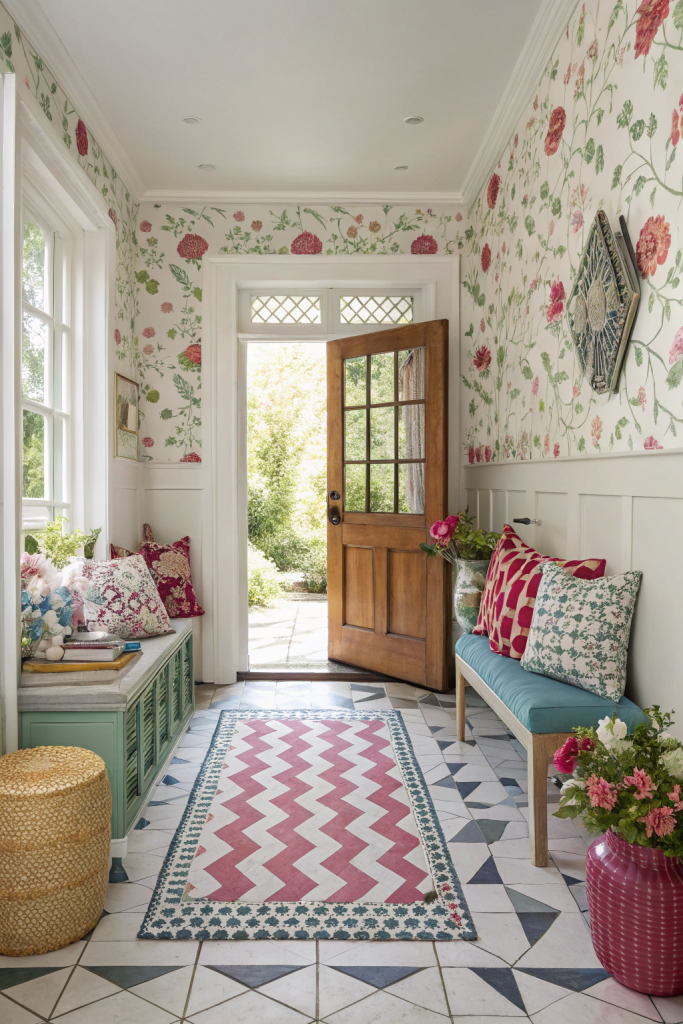 As you step into your entryway, playing with patterns instantly brings life and personality to the space. Consider mixing geometric tiles with floral wallpaper for a fresh look. Layer patterned rugs to create visual interest, and don't shy away from bold prints on cushions or side tables. These elements work together to transform your entryway into a vibrant and welcoming atmosphere.