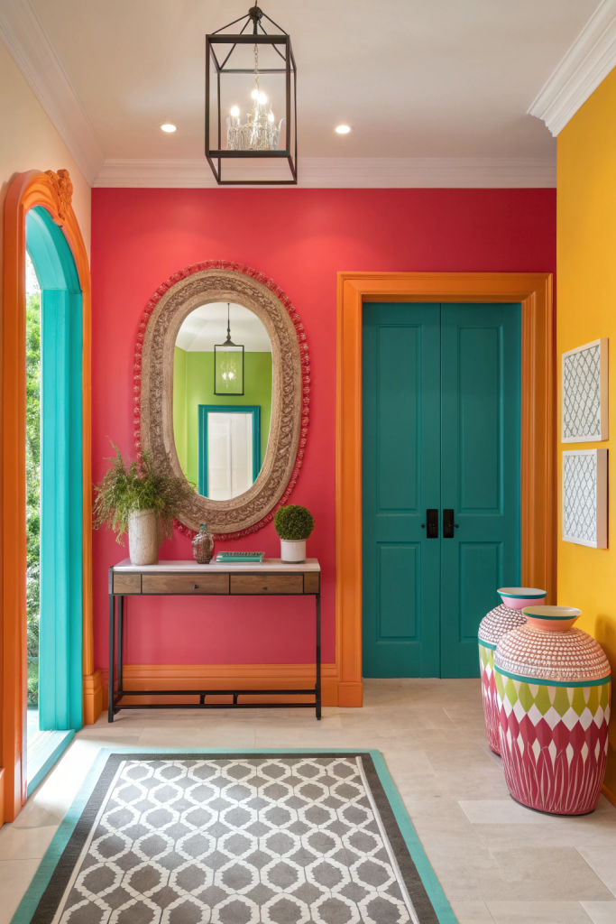 Bold colors can set an energetic tone for your entryway, but adding a statement mirror can elevate the space even further. Choose a mirror with an interesting frame or unique shape that reflects your style. It doesn't just provide a functional purpose; it also creates an illusion of more space and light, making your foyer feel welcoming and vibrant.