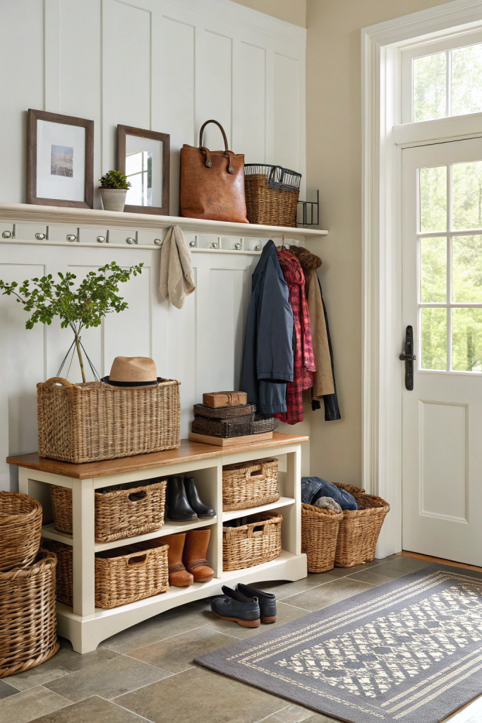 Wicker baskets can add both charm and practicality to your entryway. You can use them to store shoes, umbrellas, or pet supplies, keeping clutter at bay. Consider placing a few baskets on shelves or beneath a console table for easy access. Choose different sizes to create visual interest, and incorporate natural fibers to enhance the overall aesthetic of your welcoming space.