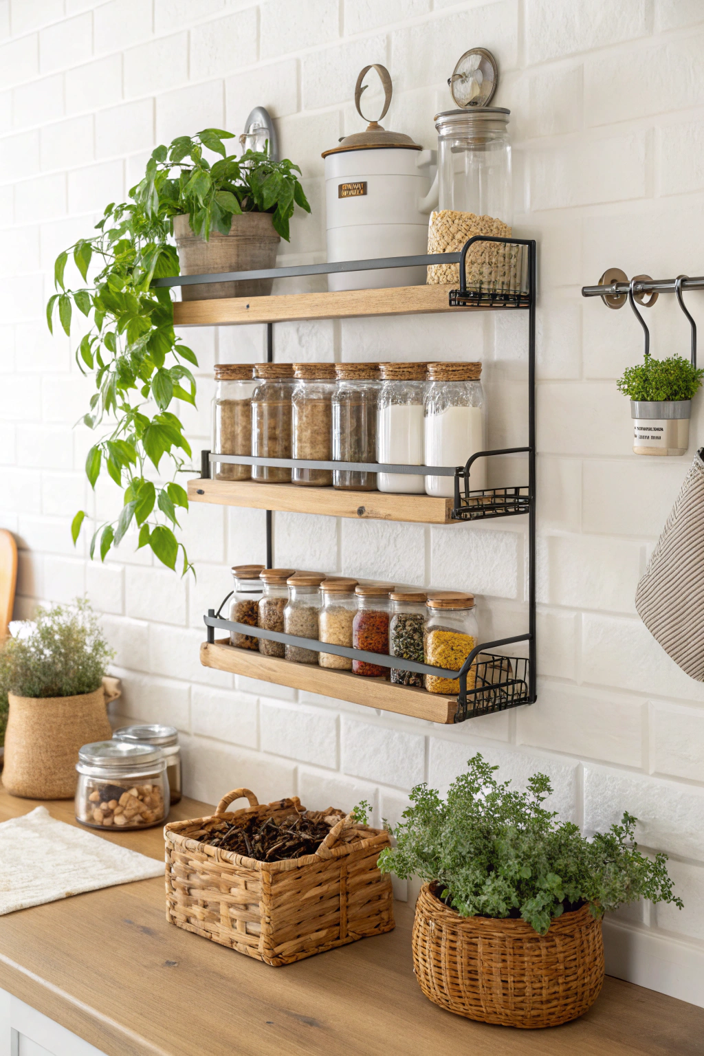 PinAdding plant-based decor can brighten your kitchen, and pairing that with creative spice racks can take it to the next level. Consider wall-mounted racks for a space-saving solution or opt for tiered designs that display your spices beautifully. You could also use mason jars or small baskets to add a rustic touch. Whatever you choose, make sure your spices are easily accessible and visually appealing.