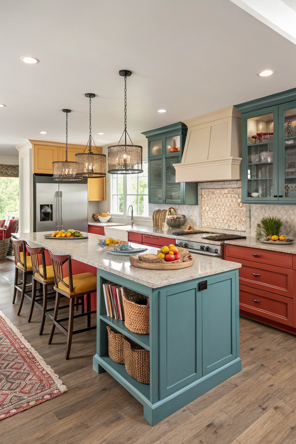 PinBringing energy into your kitchen isn't just about bold color palettes; it's also about maximizing functionality. A multi-functional island serves as a central workspace, dining area, and storage solution. You can prepare meals, enjoy casual breakfasts, or entertain guests all in one spot. Consider adding seating or built-in appliances to enhance versatility, making your kitchen the heart of your home.