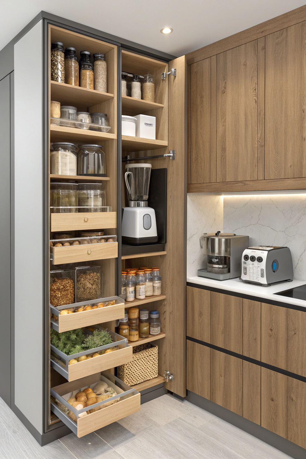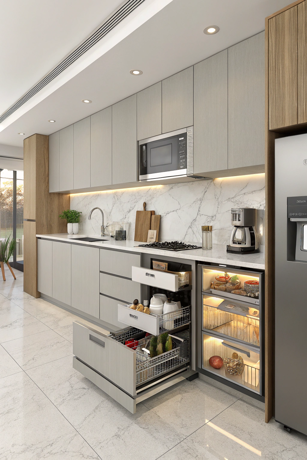 PinHow can you maximize your kitchen's functionality while maintaining a sleek aesthetic? Consider integrating hidden appliances. You can install under-cabinet microwaves or dishwashers that blend seamlessly with your cabinetry. This approach not only saves space but also reduces visual clutter. Additionally, look for pull-out or slide-out designs for refrigerators or mixers, making your kitchen efficient and stylish without compromising on design.