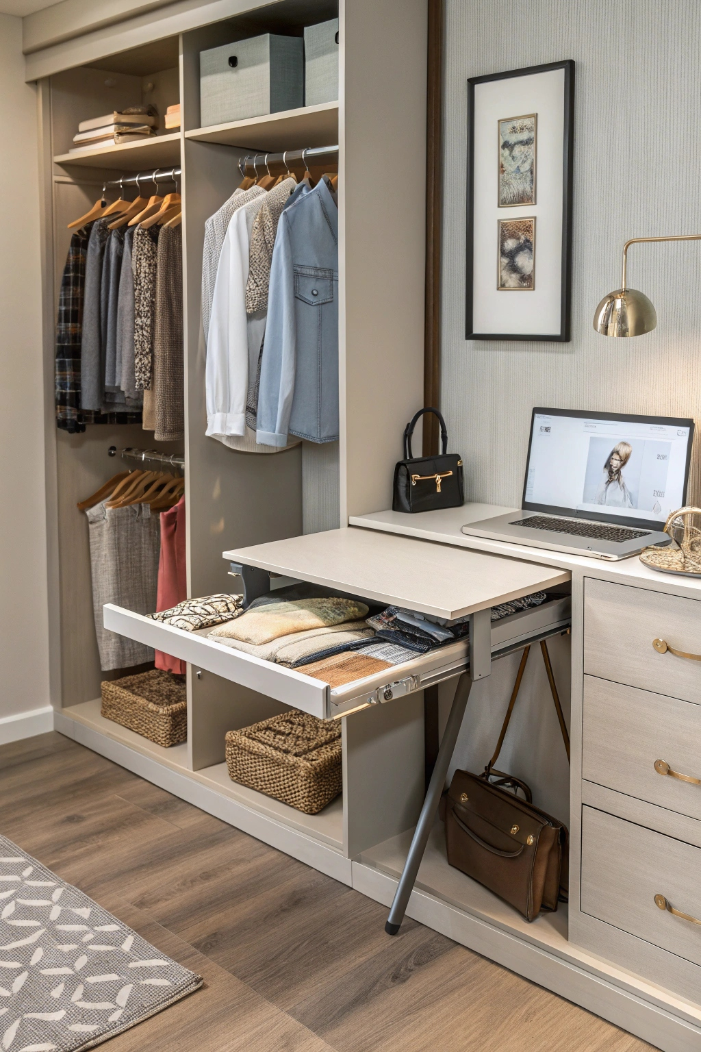 PinA fold-out table can be a fantastic addition to your walk-in closet, maximizing space and functionality. When you need extra surface area for folding clothes or organizing accessories, simply pull it down. You can even use it as a dressing table, enhancing your daily routine. When you're done, fold it back up to maintain a tidy and streamlined closet environment.