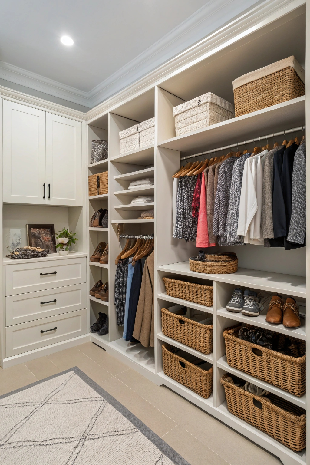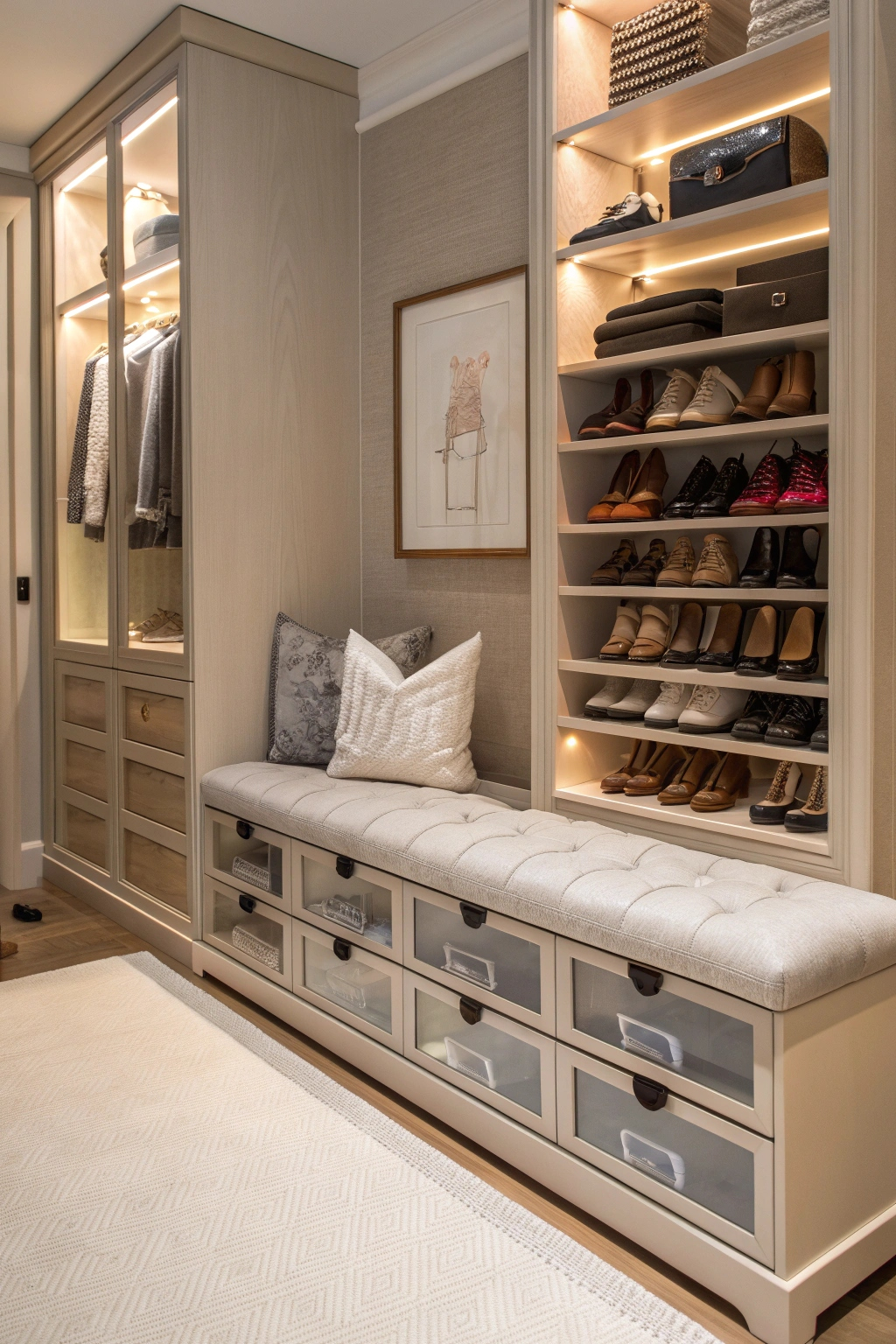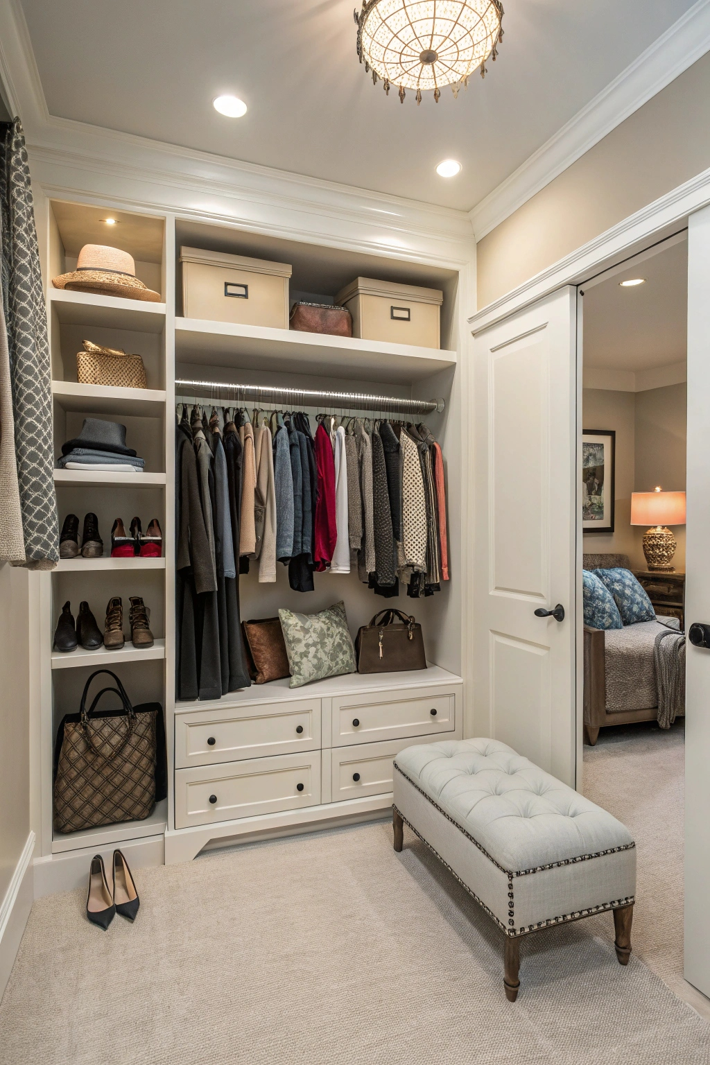 PinAdding a seating area can elevate the practicality of your walk-in closet, especially after organizing with wall-mounted hooks. Consider a small bench or a chic ottoman where you can sit while putting on shoes or selecting outfits. This space not only adds comfort but also encourages you to take a moment, making the closet a more enjoyable part of your daily routine.