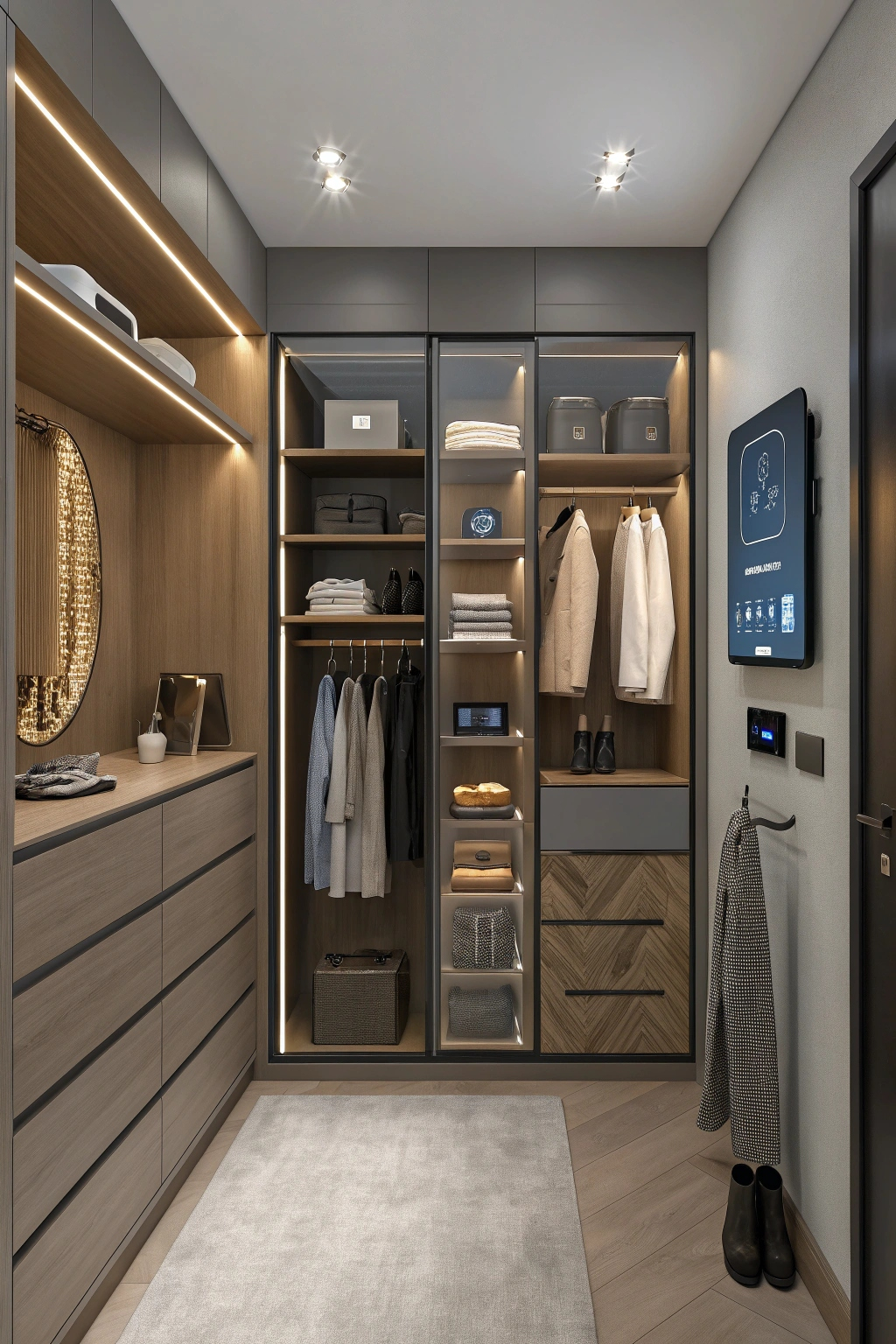 PinEnhancing your walk-in closet goes beyond art—smart tech can elevate your organization and convenience. Consider integrating automatic lighting that turns on as you enter, or clever inventory systems that track your clothing. Smart mirrors with touch screens can help you plan outfits, while Bluetooth speakers can set the mood. These tech additions not only streamline your routine but also add a modern touch to your space.