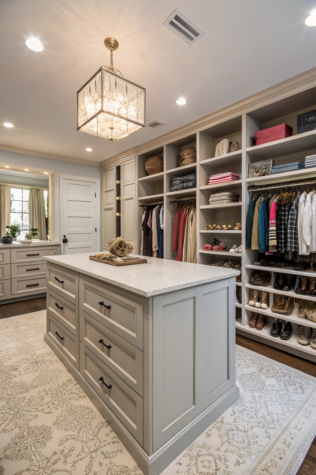PinWhen it comes to maximizing space and functionality in your walk-in closet, island storage features can be a game-changer. You can incorporate a central island to create additional storage options. Use drawers for accessories, and open shelves for shoes or folded items. Adding a countertop allows for easy outfit planning or putting on your shoes, making your closet both practical and stylish.