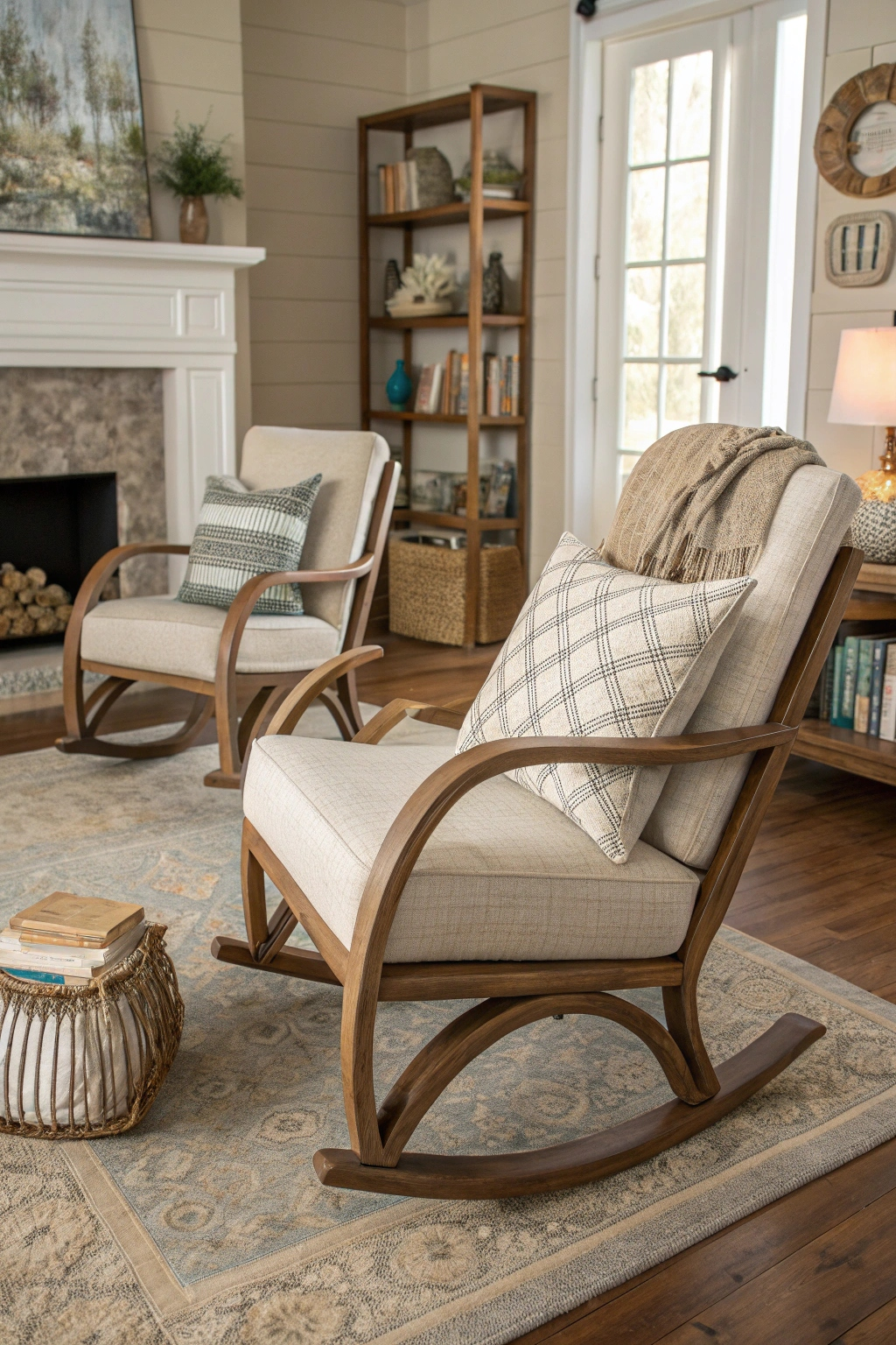 PinFarmhouse-inspired rocking chairs offer a charming blend of comfort and rustic appeal that can transform your living room into a cozy retreat. You'll appreciate their wide armrests and curved rockers, perfect for relaxing with a good book. Opt for distressed finishes or soft, neutral fabrics to enhance that farmhouse vibe, and create a warm, inviting space that feels like home.