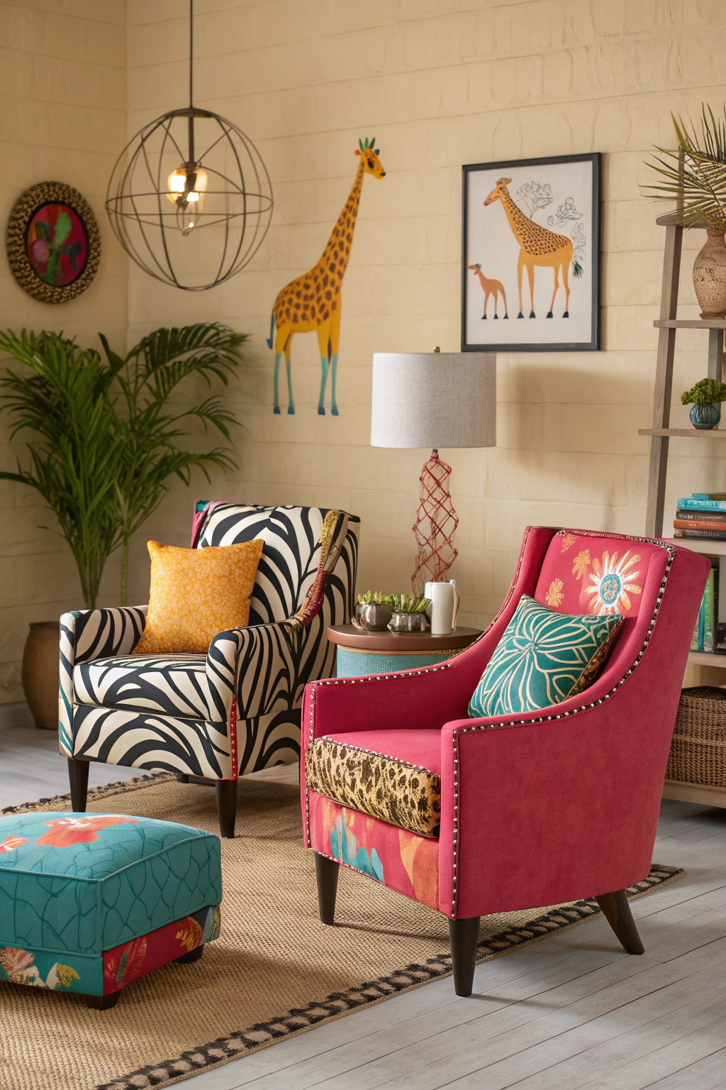 PinIncorporating fun animal prints into your living room can add a playful twist that energizes the space. Choose accent chairs featuring bold zebra stripes, colorful leopard spots, or whimsical giraffe patterns to create a focal point. These designs will not only captivate attention but also bring character to your décor. Mix and match with solid colors for a balanced look that remains stylish.