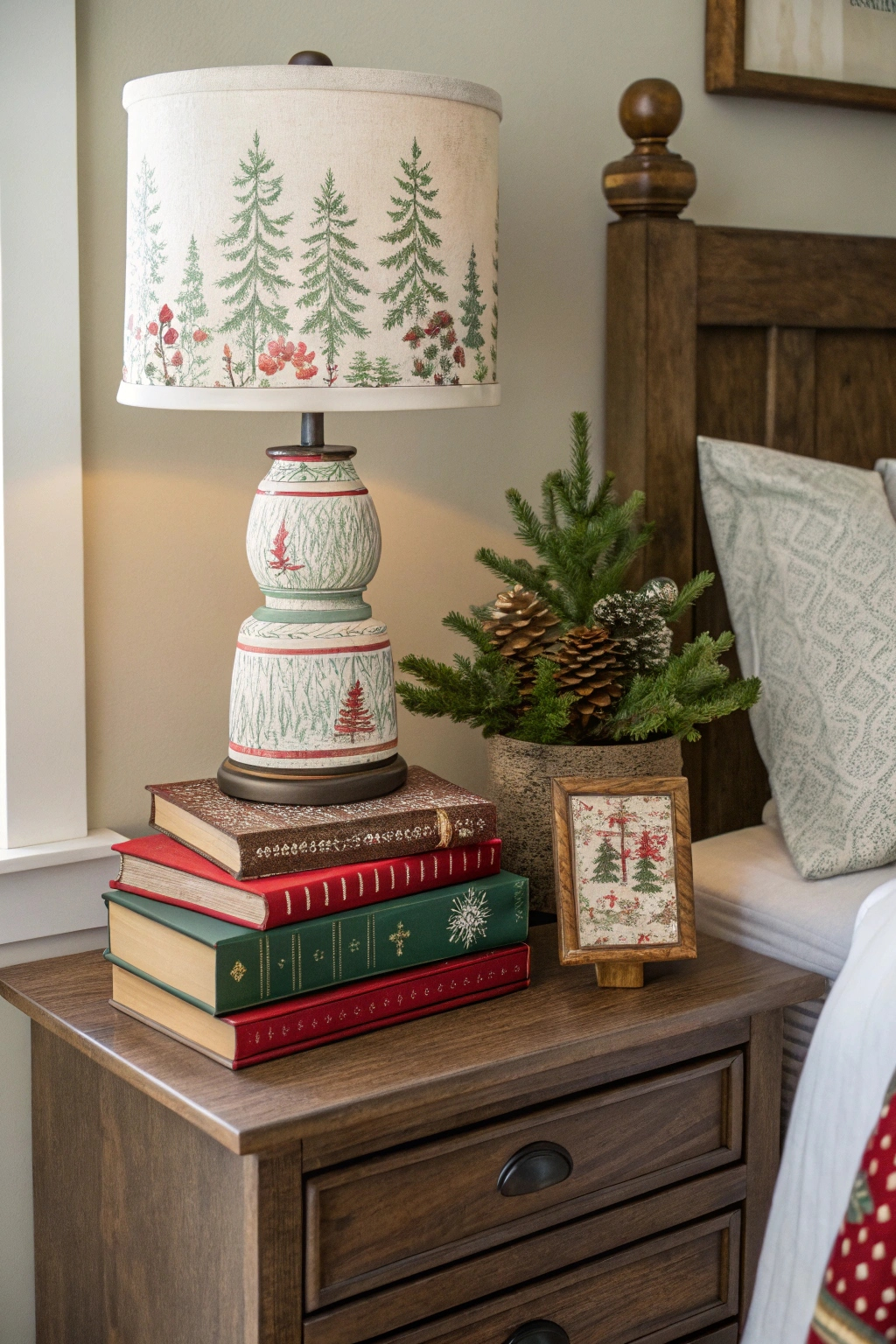 PinAn eye-catching nightstand display can instantly uplift the festive atmosphere of your Christmas bedroom. Start by layering various heights; stack books underneath a charming holiday-themed lamp. Add a small evergreen arrangement or a decorative figurine for a pop of color. Finish with personalized touches, like a photo of your favorite holiday memory, to create a warm, inviting space that reflects your unique style.