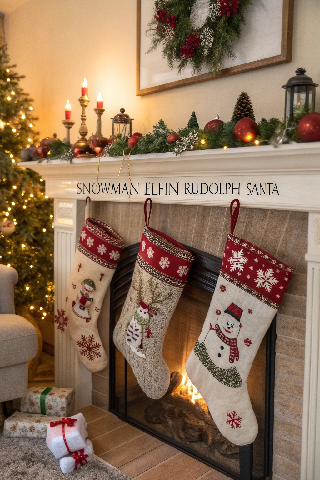- Personalized stockings with family names.