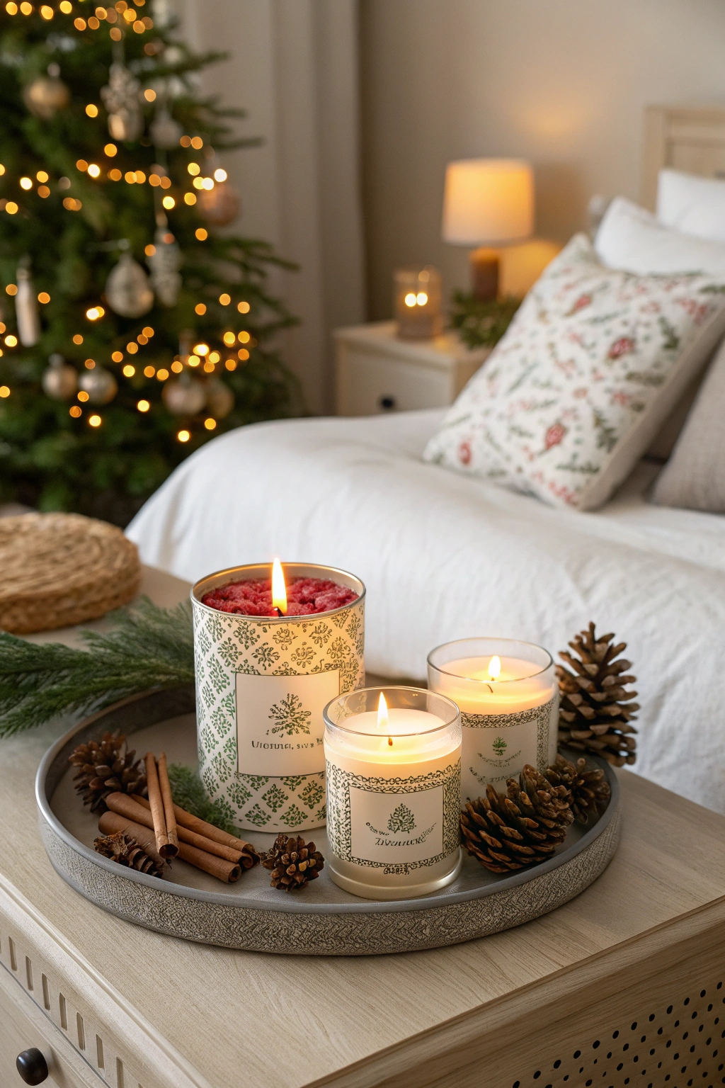 PinThe holiday season is all about creating a warm and inviting atmosphere, and scented candle arrangements can add a cozy charm to your Christmas bedroom. Choose candles with festive scents like cinnamon, pine, or vanilla. Cluster them on a decorative tray or arrange them on your nightstand. When lit, they'll fill your space with a comforting glow and delightful fragrance, enhancing your holiday spirit.