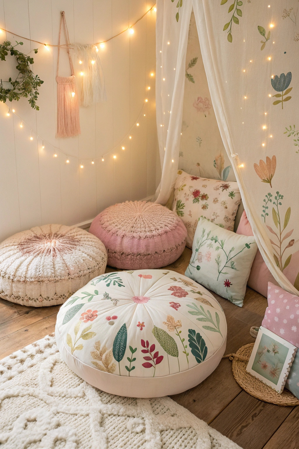 PinCreating a cozy corner in your fairy-themed room becomes even more delightful with dreamy floor cushions. They add comfort and style, making the space inviting. To enhance your corner, consider: