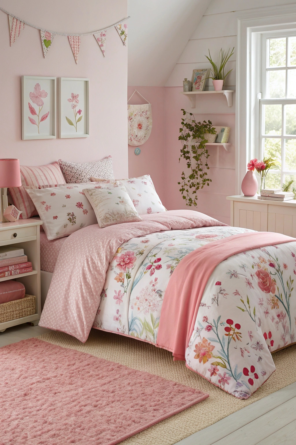 PinA beautiful way to enhance your girly pink bedroom is by choosing floral pink bedding. This design not only adds a vibrant touch but also brings in a natural, cheerful vibe. Look for patterns that incorporate various shades of pink and soft pastels. Layer comforters and decorative pillows for a cozy feel that invites relaxation and complements your overall room theme beautifully.