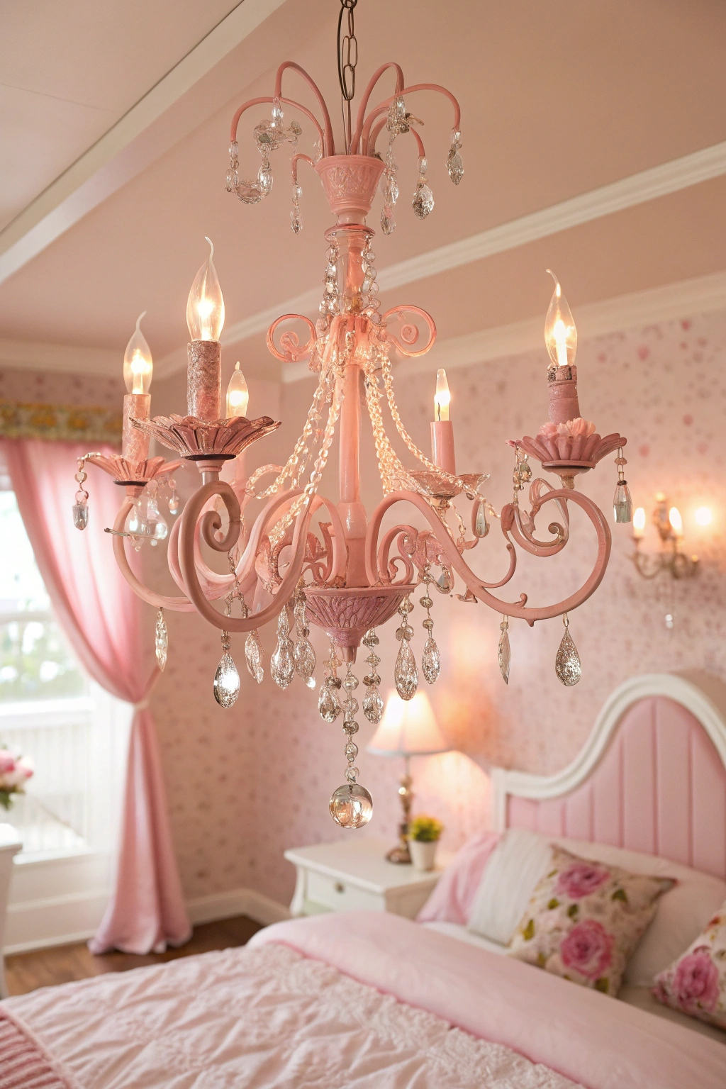PinAdding a vintage pink chandelier can elevate the elegance of your girly bedroom, creating an enchanting focal point. The soft glow of the chandelier casts a warm ambiance, perfect for cozy evenings. Look for intricate designs with crystals or floral motifs that complement your decor. Hanging it at the right height guarantees it dazzles, becoming a beautiful centerpiece that captures attention.