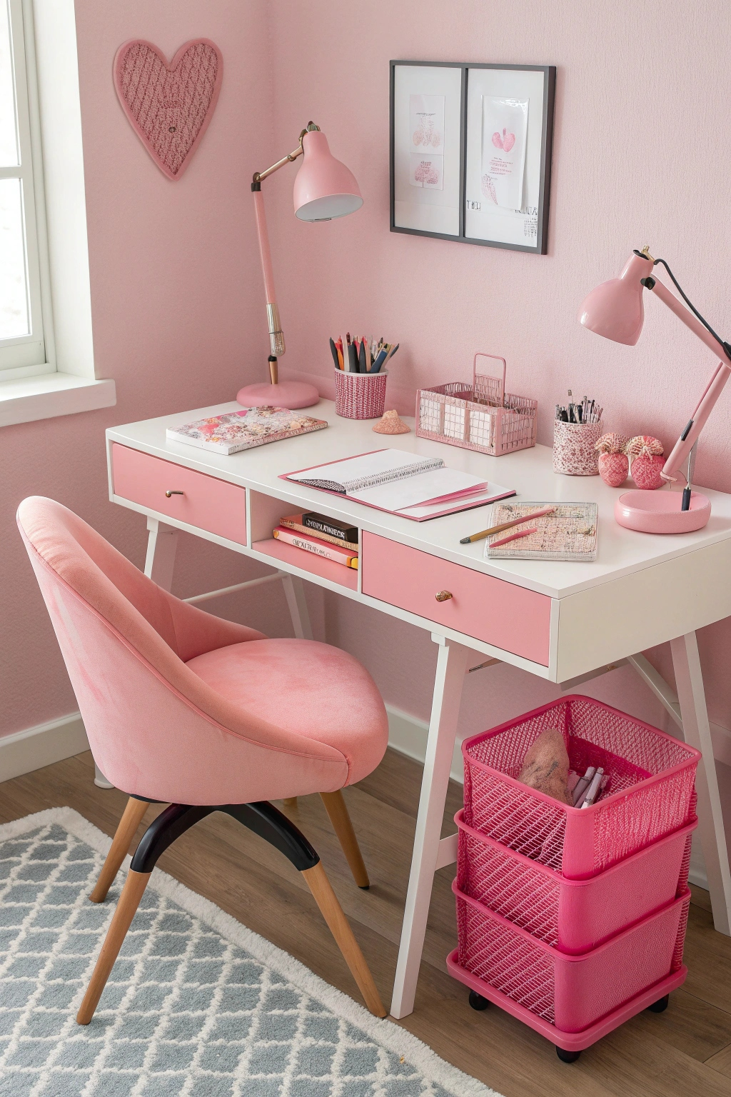 - Pink Desk Accessories: Use vibrant pink organizers and pens.