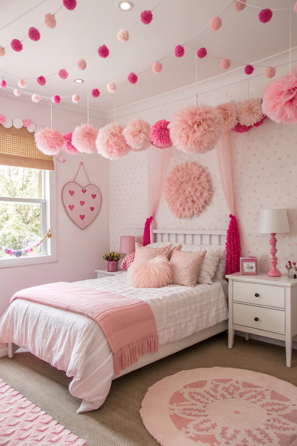 PinOne's girly pink bedroom can instantly come alive with the playful addition of pom pom pink decor. Incorporate pom pom pillows on your bed or chair for a chic touch. Hang pom pom garlands across the walls or ceiling for a whimsical vibe. These fluffy accents add softness and color, transforming any space into a fun, inviting retreat that expresses your unique style.
