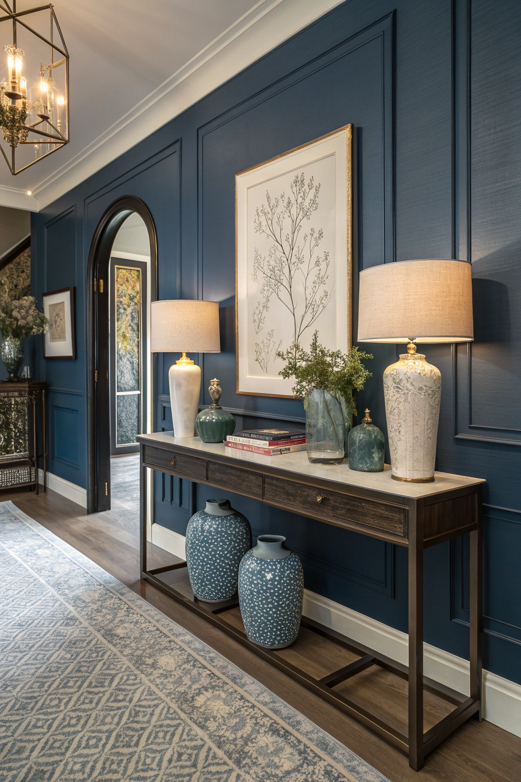 PinStylish console tables set the stage for an entryway, but bold wall paint takes the design up a notch. Choose deep hues like navy or emerald for a striking backdrop. It instantly elevates the space, creates a warm atmosphere, and invites guests in. Add some artwork or decorative elements to complement the color, making your entryway a true reflection of your style.