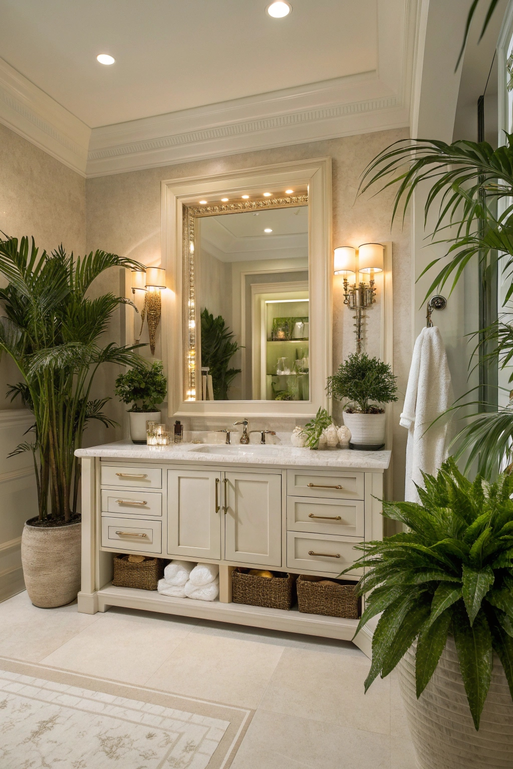 PinComplementing your indoor plants and greenery, an elegant vanity can transform your spa bathroom into a true oasis. Choose a stylish piece with clean lines and a rich finish. Incorporate ample storage to keep toiletries organized and clutter-free. Include chic lighting above or around the vanity to enhance the ambiance. A stunning mirror can also elevate your elegant design, adding depth and sophistication.