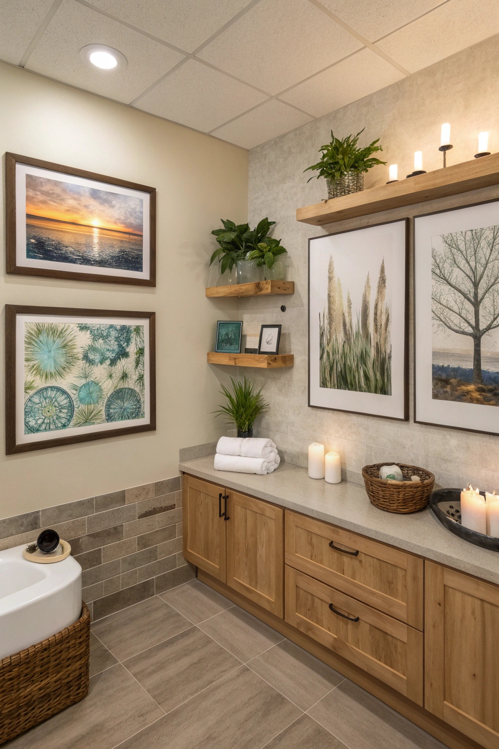 PinIncorporating wall art and decor can elevate your spa bathroom into a tranquil retreat. Choose calming themes, like nature or abstract designs, to create a serene atmosphere. Hang framed prints or canvas art at eye level for an inviting touch. Consider wooden shelves or stylish hooks to display decorative items, such as candles and plants, enhancing both aesthetics and functionality in your space.