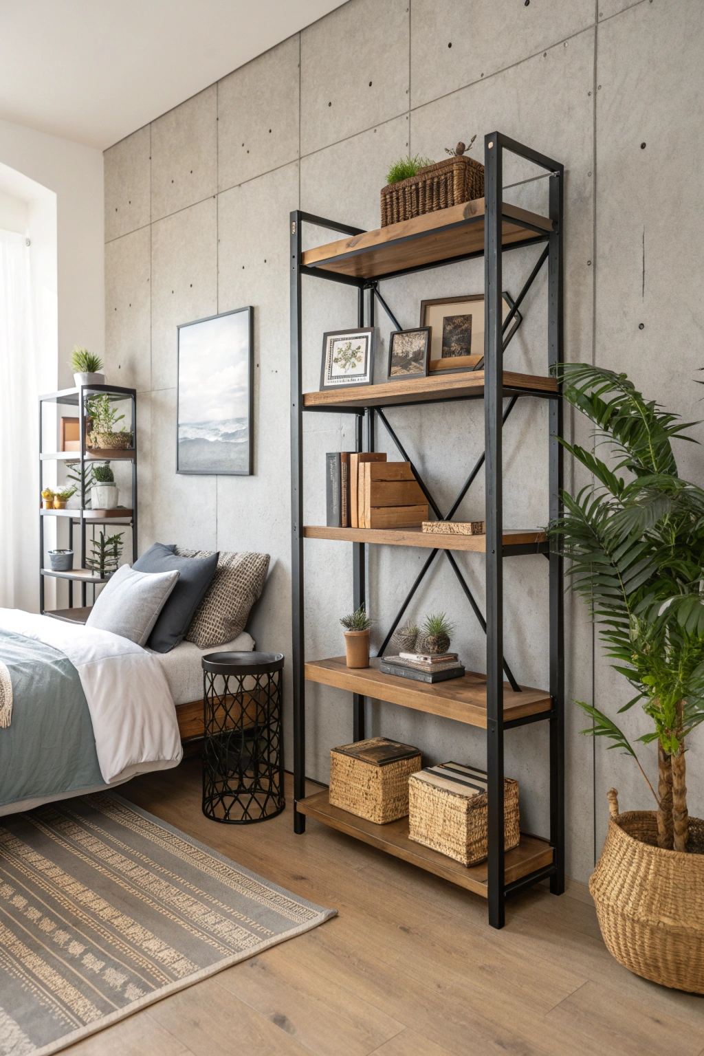 PinFor a bold statement in your bedroom, industrial metal shelves offer a perfect blend of functionality and style. You can display books, plants, or decorative items, enhancing your space's aesthetic. Their sturdy design supports heavyweight items while maintaining an open, airy feel. Pair them with wood accents for a warm contrast or keep it sleek for a modern vibe—there's versatility for any preference.