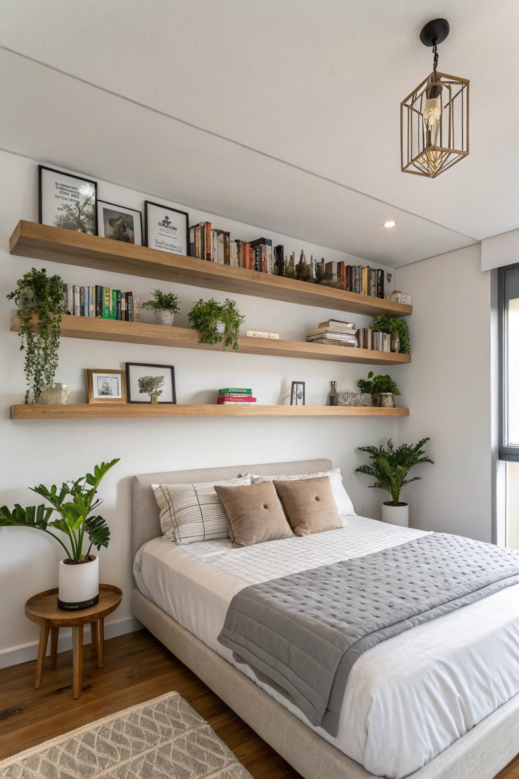 PinIf you're a minimalist looking to maximize space while keeping your bedroom stylish, floating shelves are your perfect solution. They create the illusion of more room by drawing the eye upward. You can display books, plants, or decorative items without sacrificing floor space. Plus, they come in various styles and materials, allowing you to match them effortlessly with your existing decor.