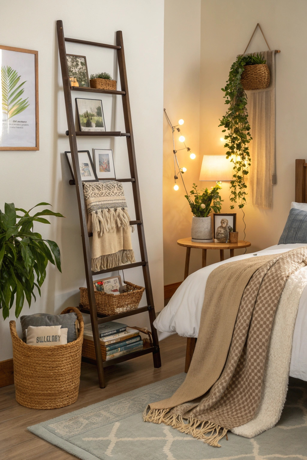 With a decorative ladder rack, your bedroom becomes more inviting and organized!