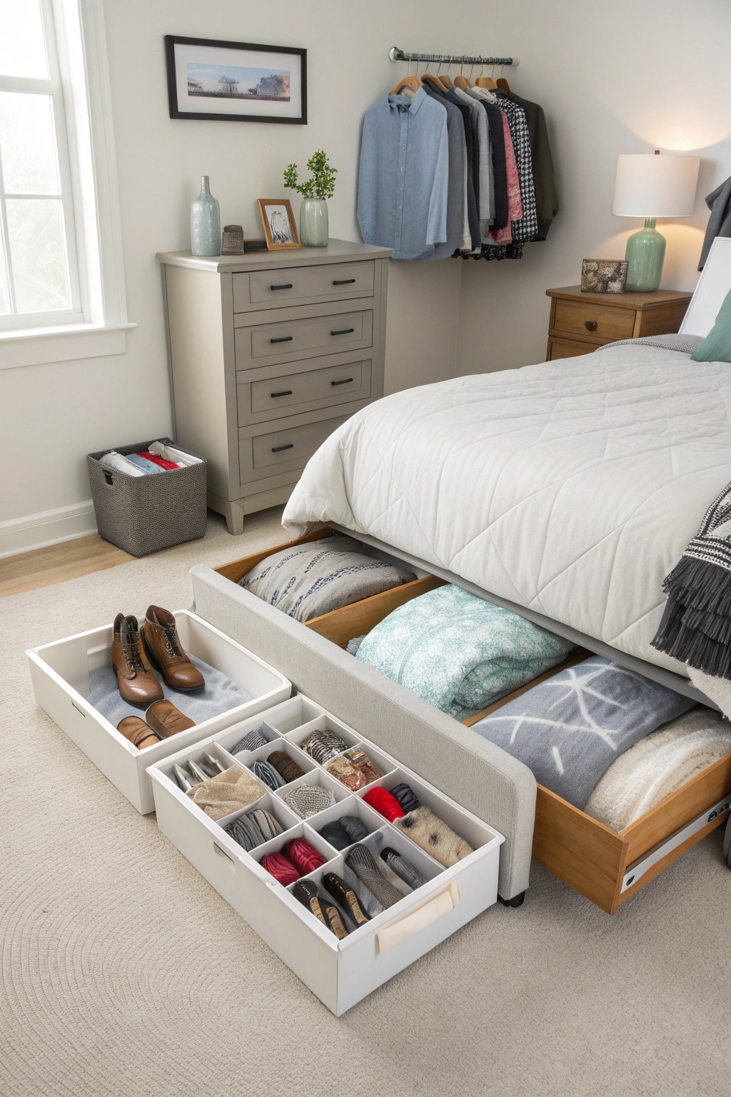 PinMaximizing your bedroom space often means taking advantage of every nook, and under-bed storage solutions are a smart way to do just that. You can use bins, drawers, or even vacuum-sealed bags to keep seasonal clothes, extra linens, or shoes organized. With just a little creativity, you'll transform that often-overlooked space into a practical storage area, keeping your bedroom tidy and organized.