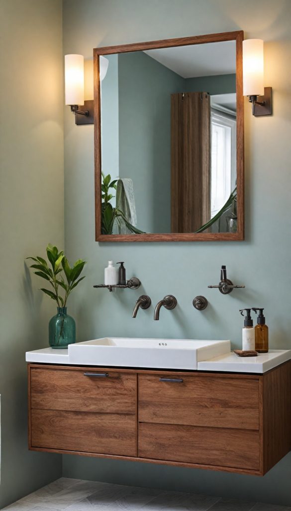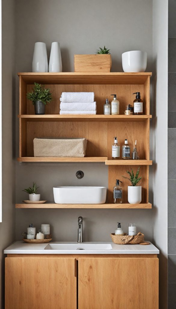 PinPracticality meets style with 60s-inspired bathroom storage solutions. Floating shelves and wall-mounted cabinets in natural wood tones keep your bathroom organized and stylish.