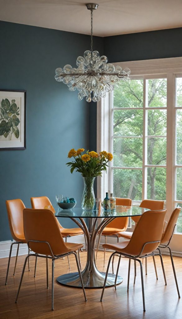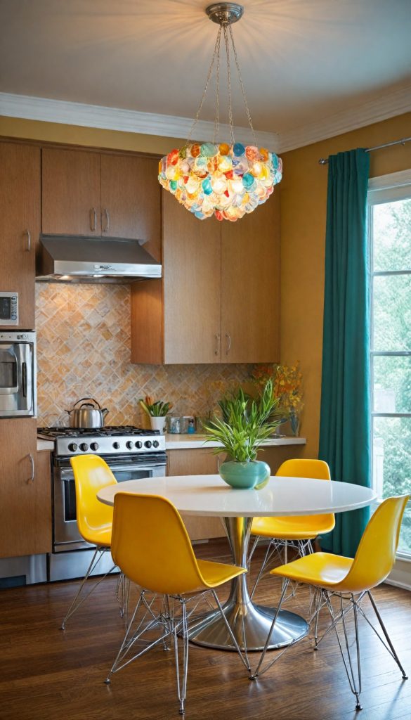 PinGive your kitchen a retro vibe with a colorful dining set. Think round tables with chrome legs and matching chairs. Add a pop of color with vibrant upholstery to capture the playful spirit of the 60s.