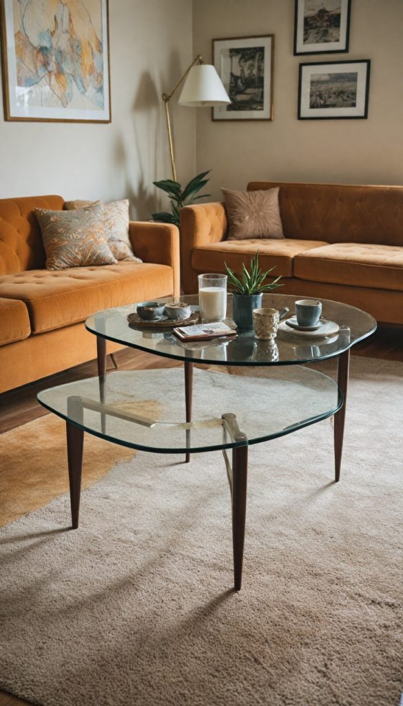 PinA 60s-inspired living room needs a unique coffee table. Opt for tables with unusual shapes and a mix of materials like glass and metal. These tables are not just functional but also a piece of art.