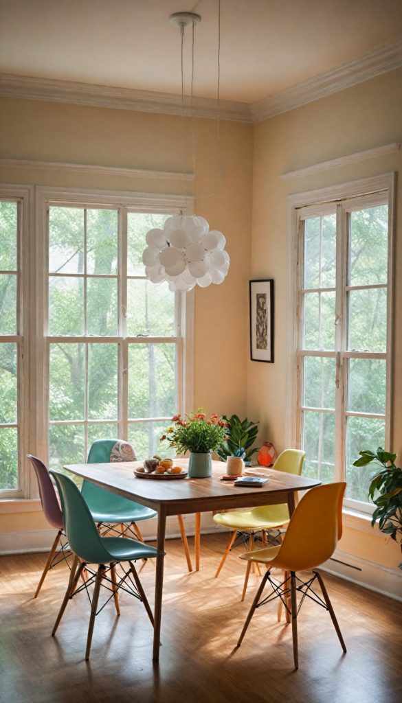 PinPair your dining table with iconic 60s dining chairs. Think Eames-style chairs with molded plastic seats and wooden legs. Mix and match colors for a playful, eclectic look.