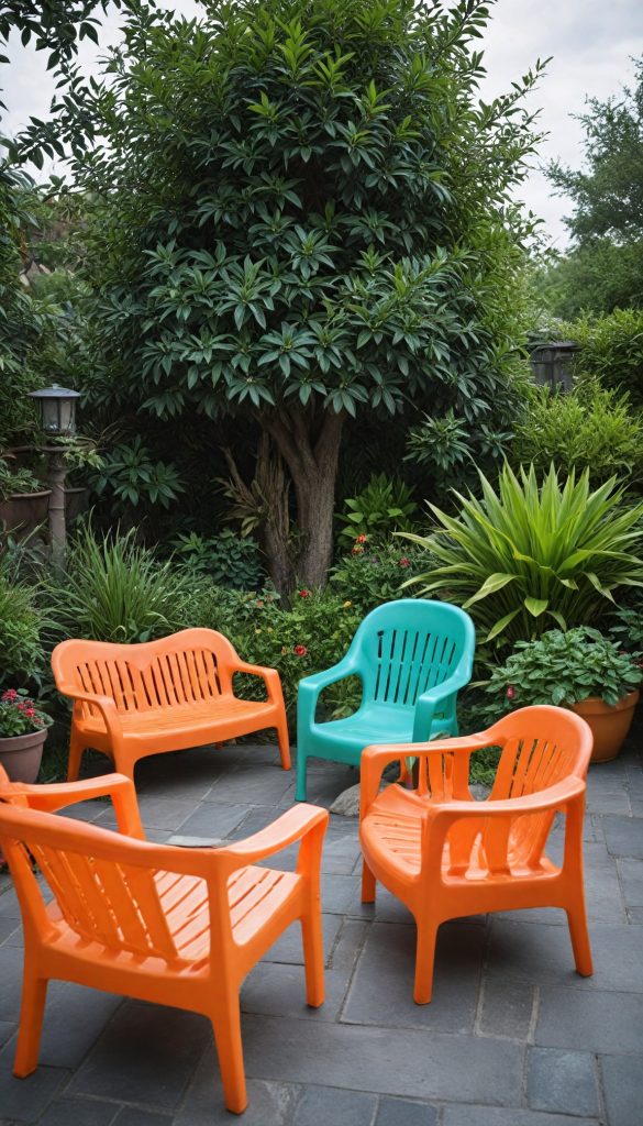PinPlastic lounge furniture was another popular choice for outdoor decor. Look for pieces in bright colors to bring a playful, retro feel to your garden or patio.