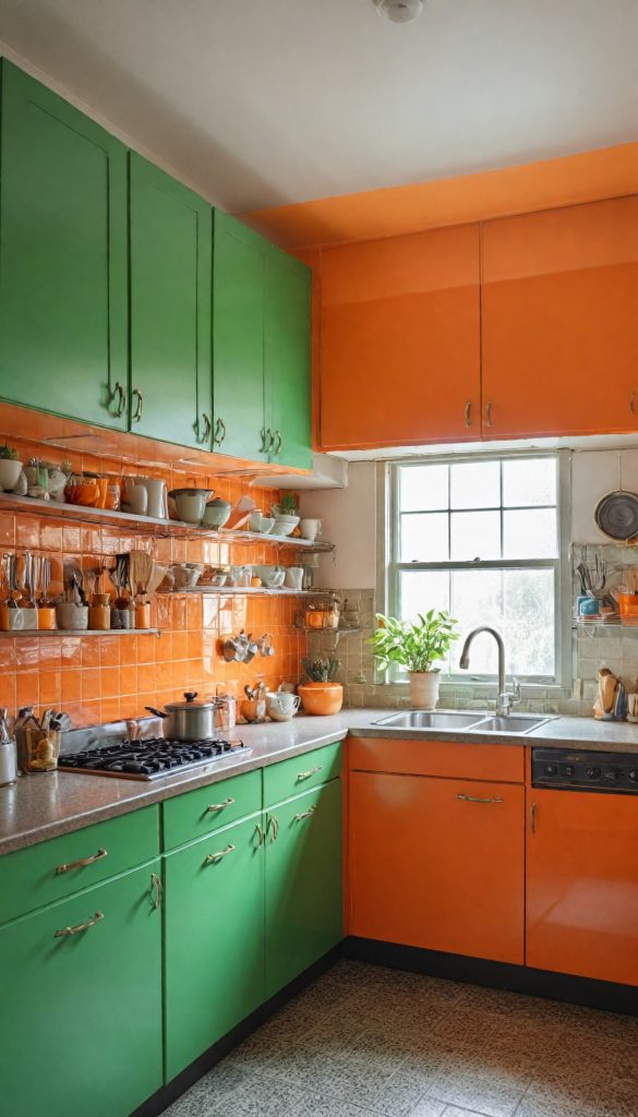 PinNothing says 70s quite like orange and green kitchen cabinets. These vibrant colors can make your kitchen feel lively and inviting. Pair them with white or wooden countertops to balance the look.