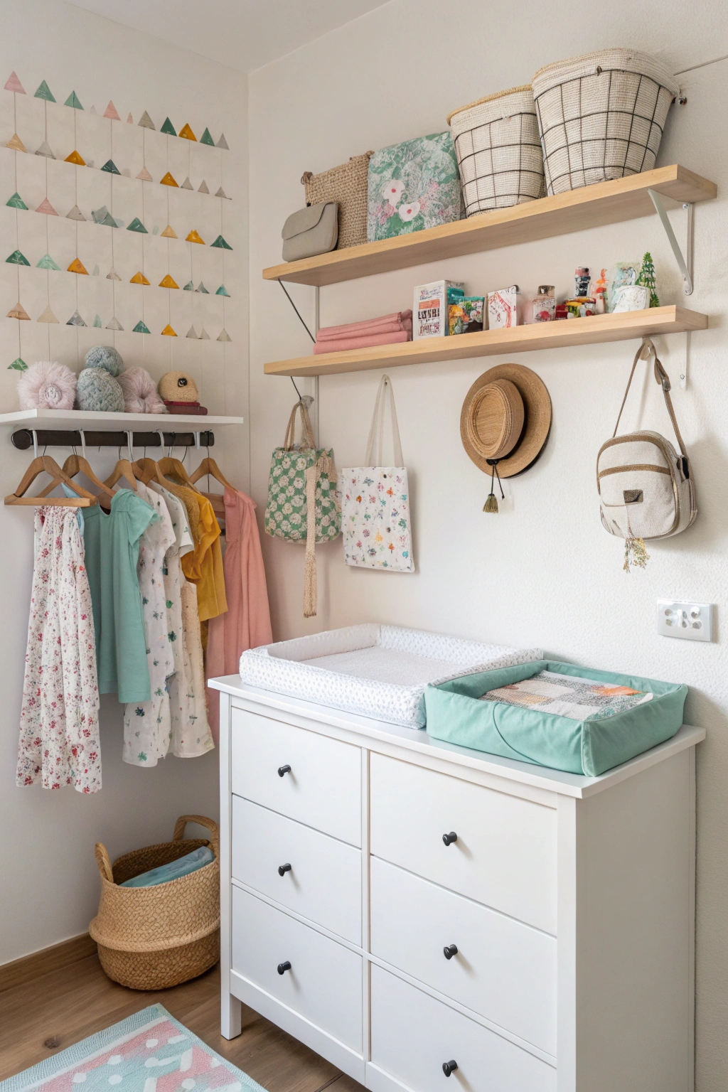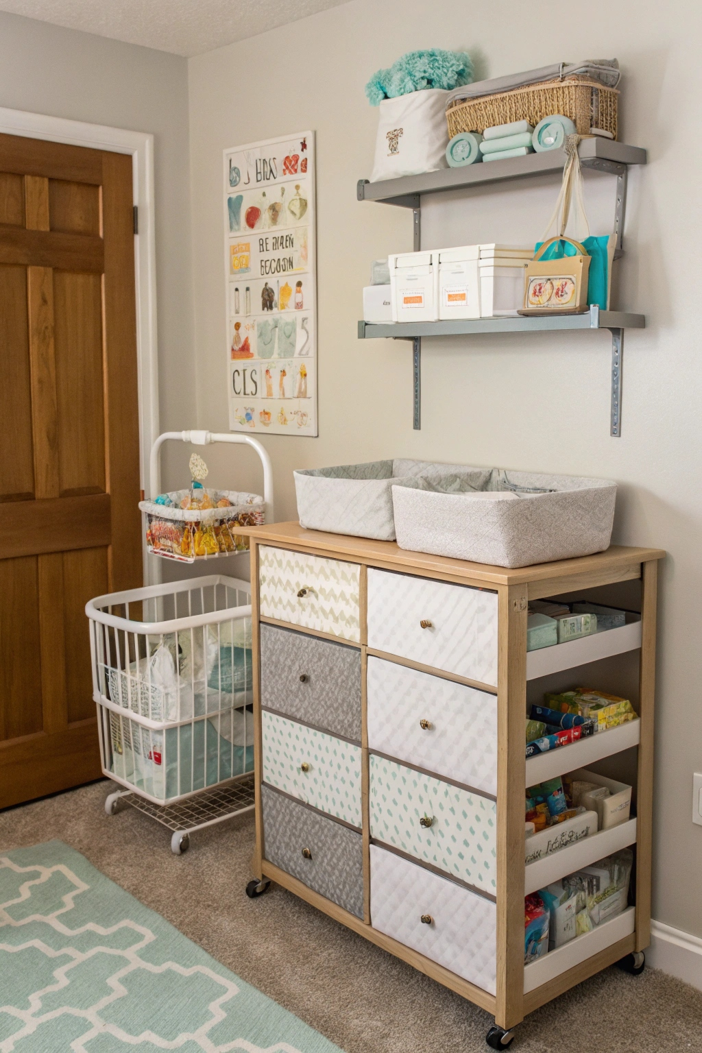 - Use wall-mounted shelves to keep diapers off the floor.