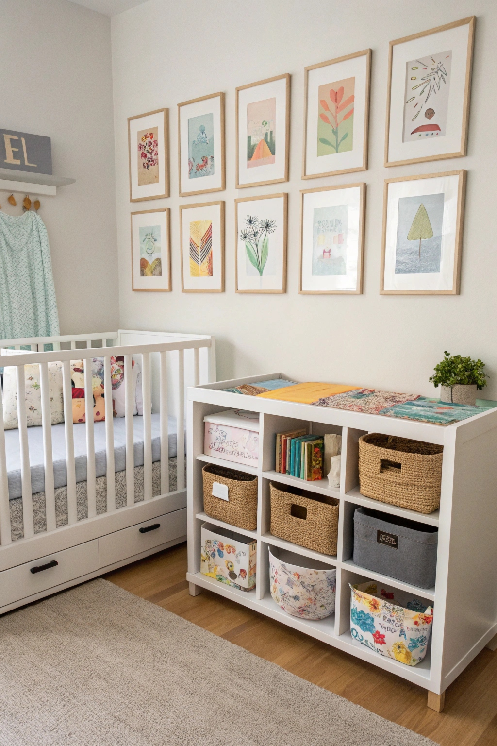 PinCreating a gallery wall is a fantastic way to display your child's art and memories, but don't forget about the often-overlooked space beneath the crib. This area can be perfect for storing bins filled with toys, extra blankets, or books. Use shallow storage containers to keep things organized and easily accessible. Maximizing under-crib space helps you maintain a tidy, functional nursery.