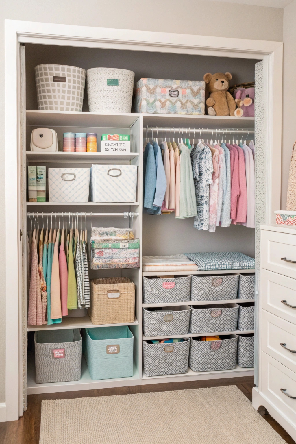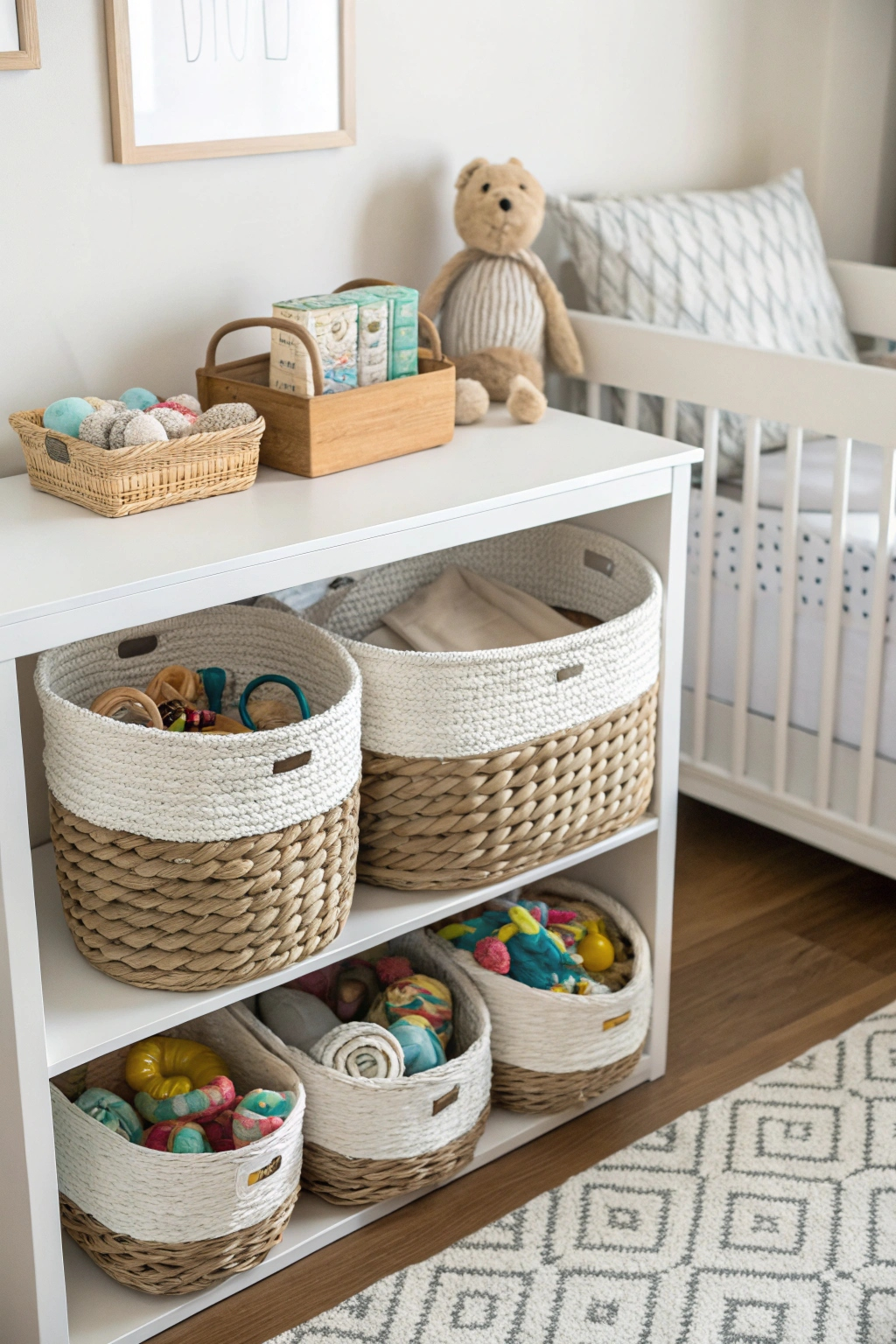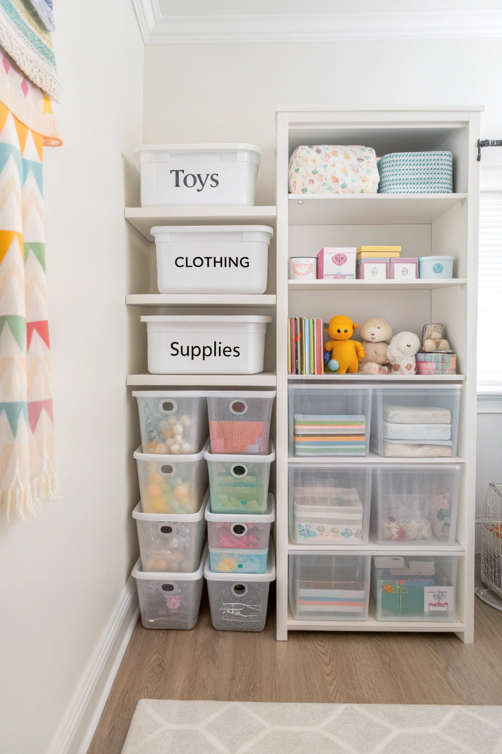 PinThere's no denying that organization plays an essential role in making a small nursery feel spacious and functional. Using clear storage bins can help you achieve this by allowing you to see everything you've got stored. Assign specific bins for toys, clothing, and supplies. This way, you can quickly grab what you need without cluttering up your space. Plus, it's easy to keep clean!