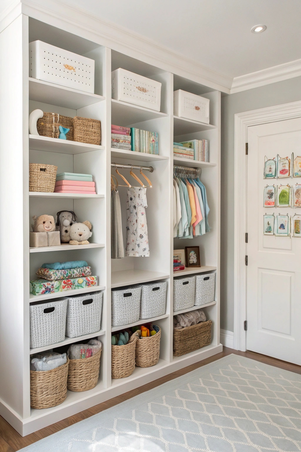 PinMaximizing your nursery space starts with a well-organized closet. Installing a closet organizer guarantees that you can make the most of vertical and horizontal space. Use shelves, bins, and hanging organizers to store clothes, toys, and baby essentials efficiently. This not only keeps everything neat but also makes finding what you need quick and easy, saving you precious time during busy days.