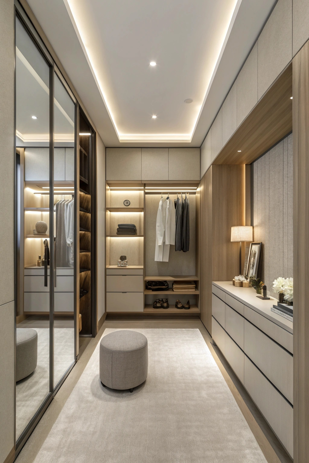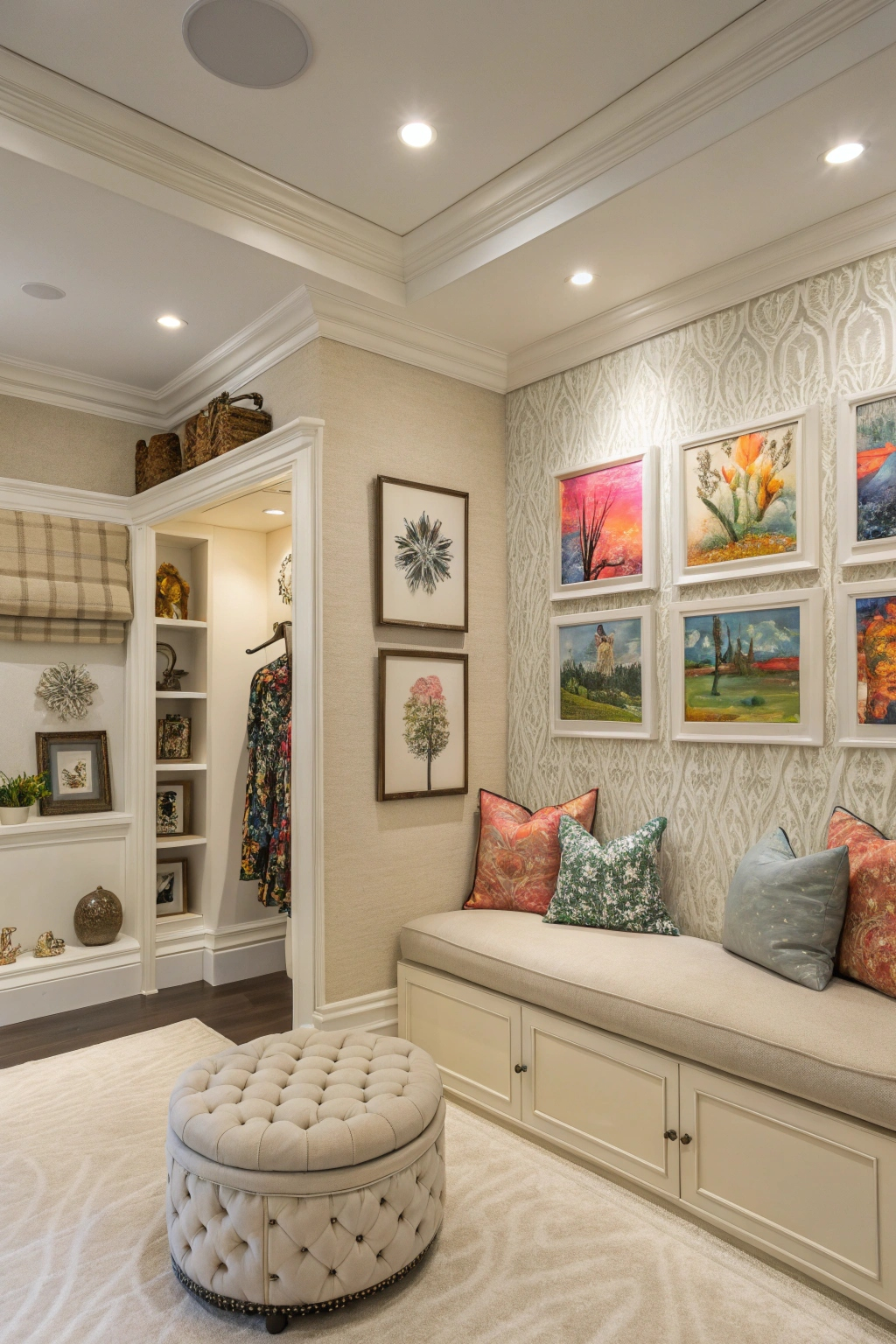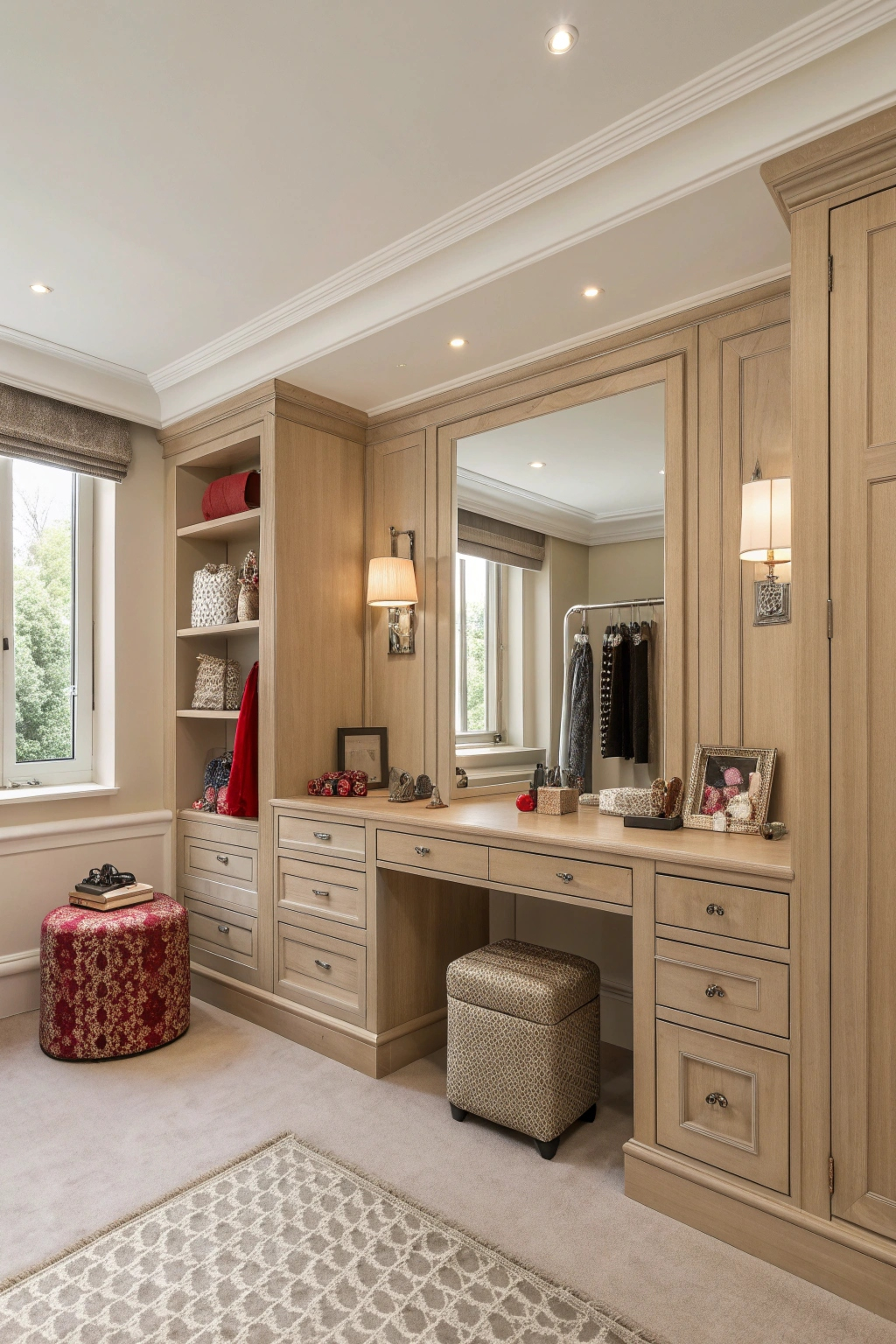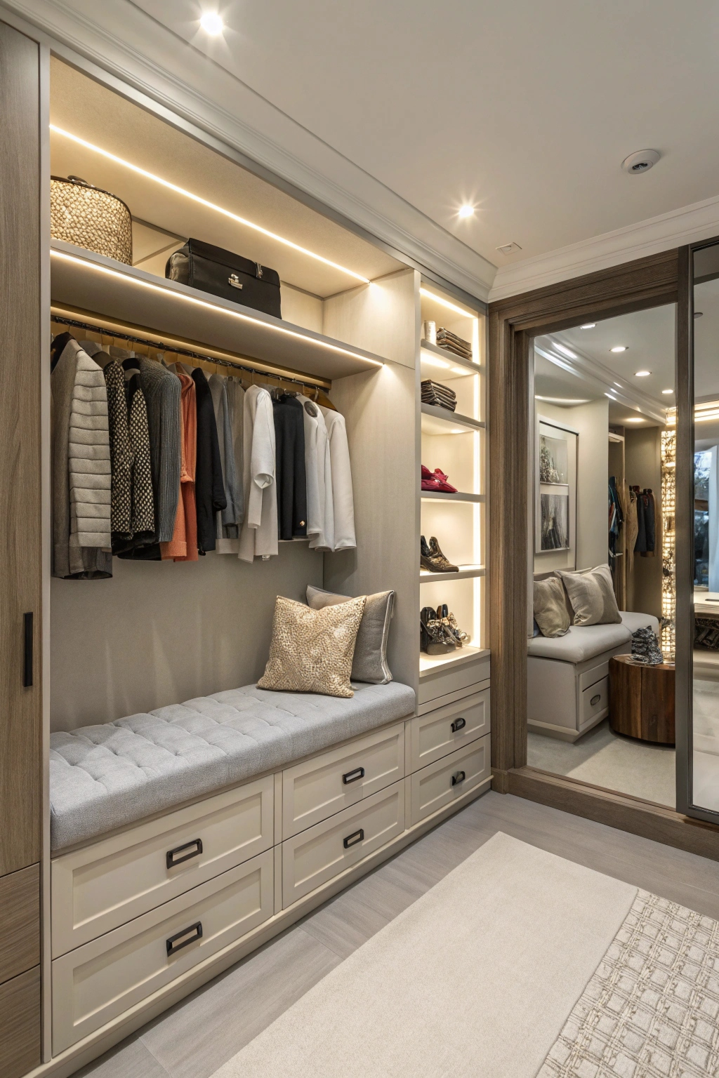 - Built-in seating: A stylish bench or ottoman makes dressing easier and adds comfort.
