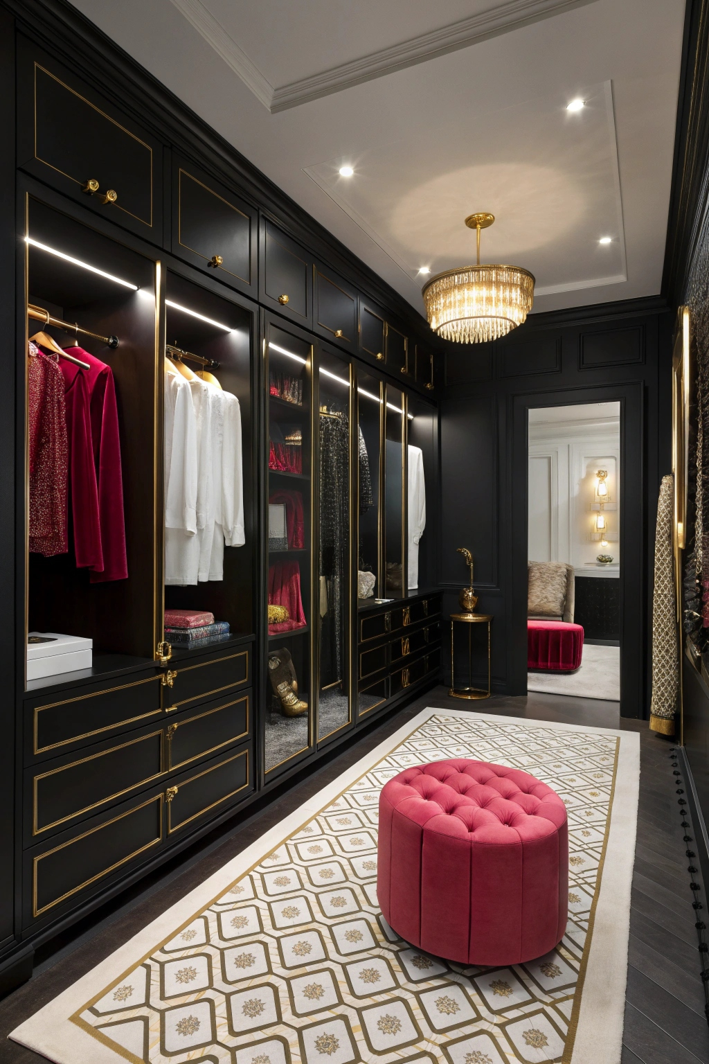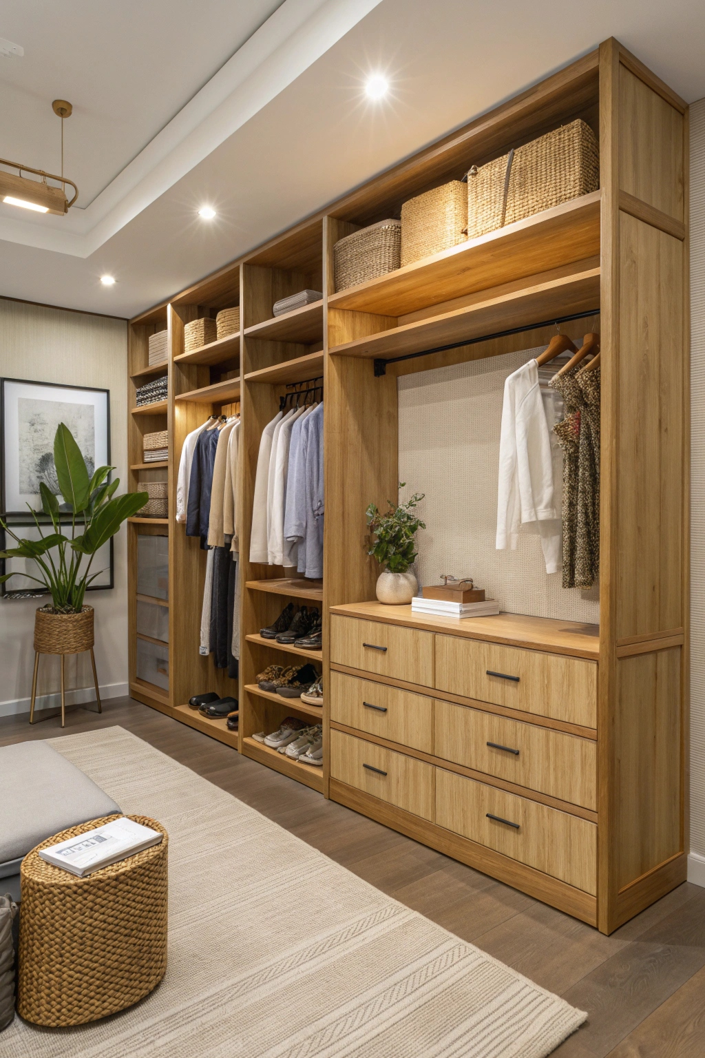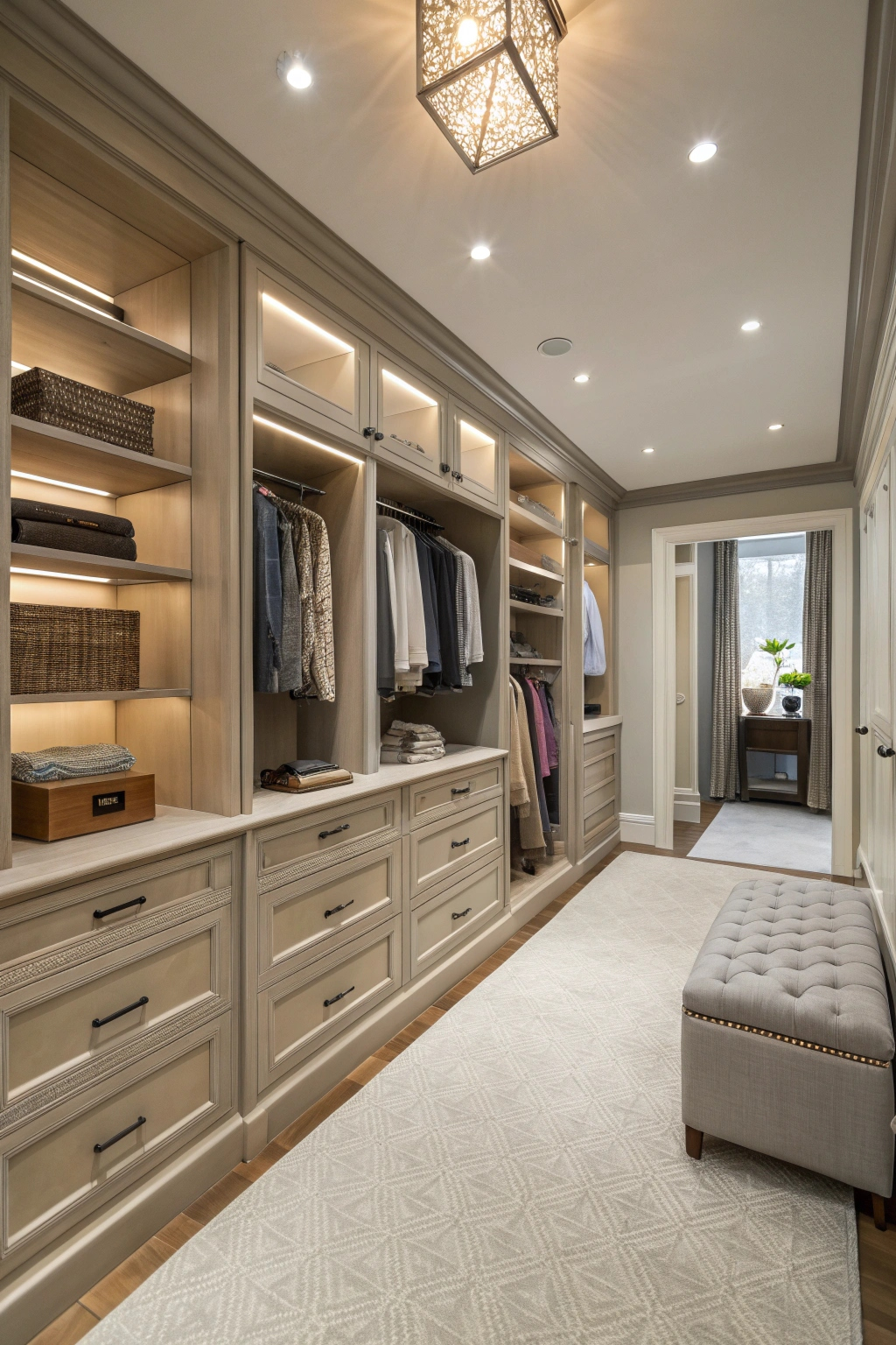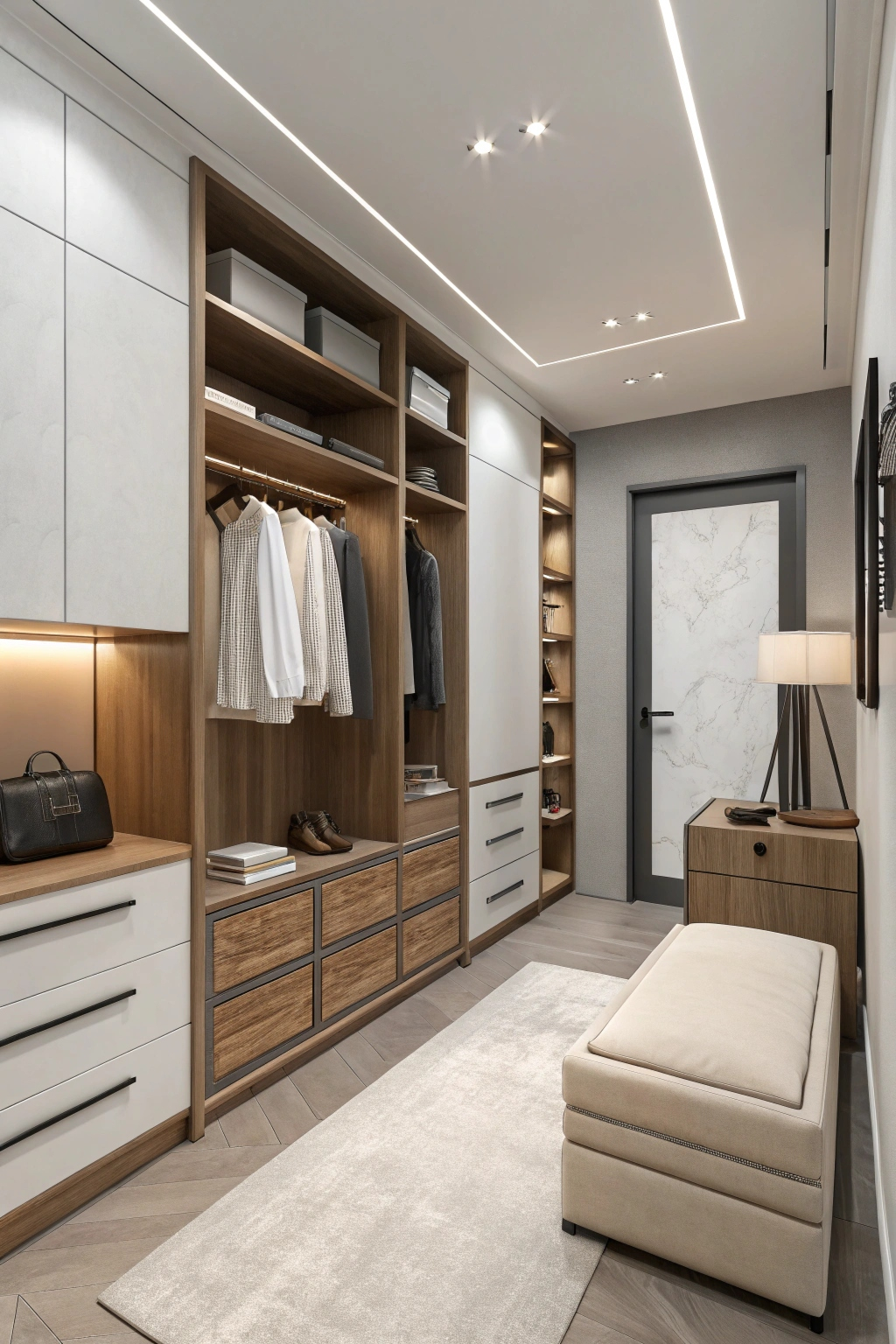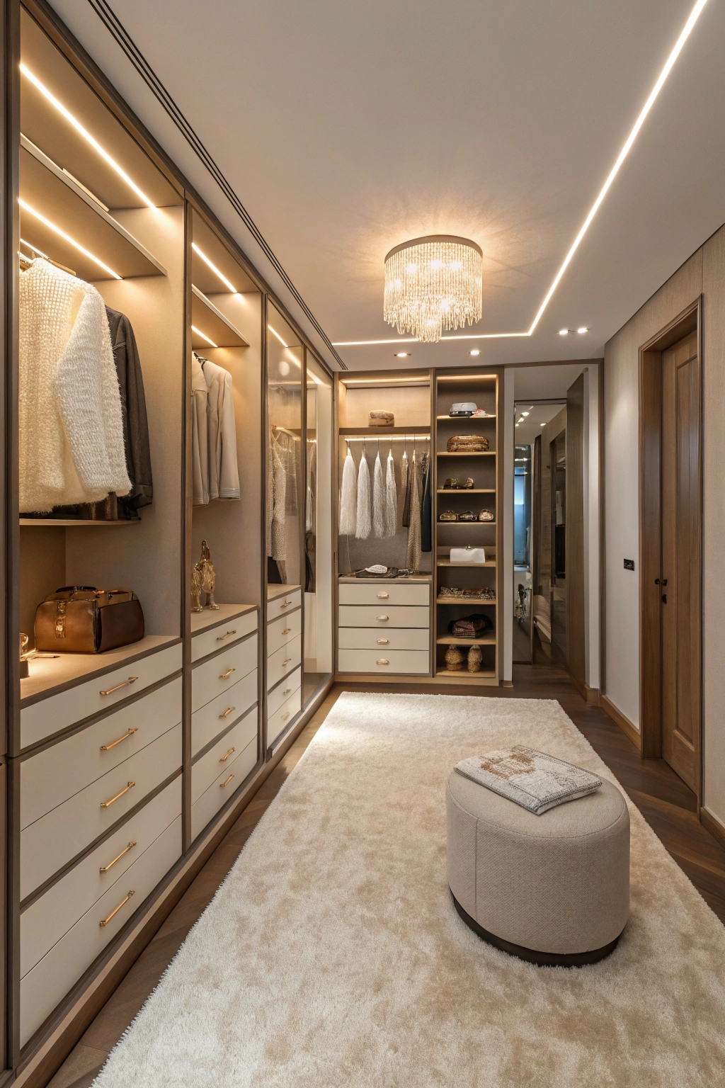 - Built-in seating: A stylish bench or ottoman makes dressing easier and adds comfort.