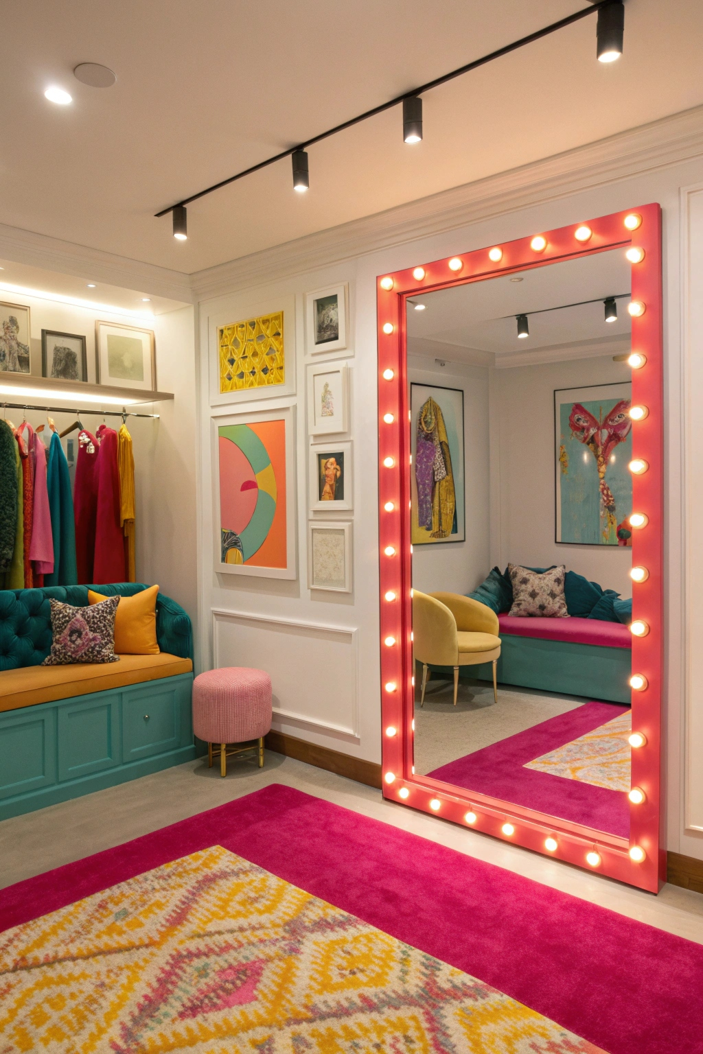 PinIncorporating bold color accents can transform your dressing room from ordinary to extraordinary. Choose vibrant hues for key pieces, like an oversized mirror frame or a striking rug. Add colorful artwork or decorative pillows to infuse energy into the space. You'll create an inviting atmosphere that reflects your personality and style, making getting dressed a more exciting and inspiring experience each day.