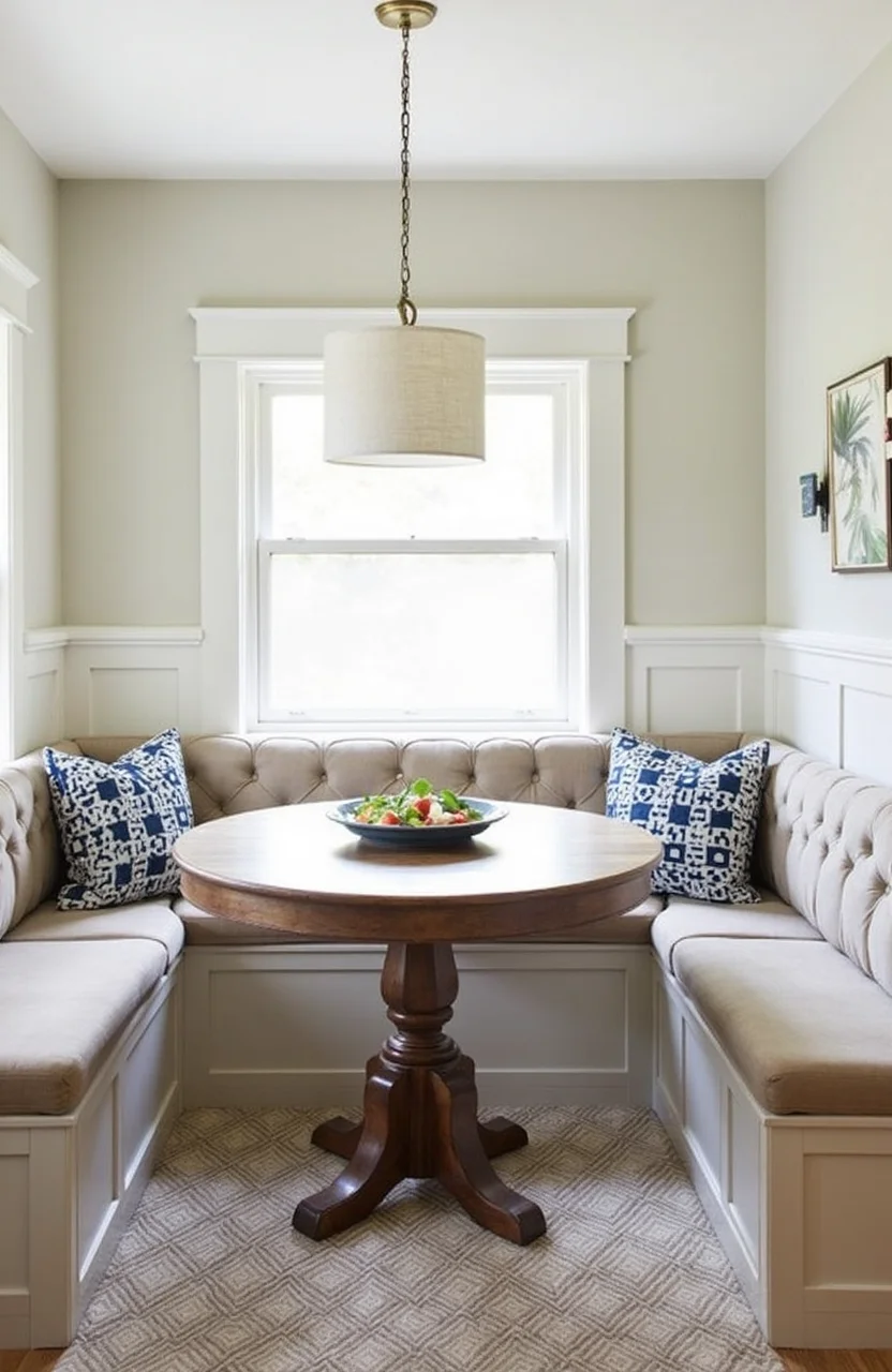 PinBuilt-in banquettes transform your dining area into a cozy nook where family and friends can gather comfortably. They maximize space, offering ample seating without bulky furniture. You can customize the design to fit your style, whether sleek and modern or charmingly traditional. Adding cushions and pillows enhances comfort, while built-in storage underneath keeps your dining essentials organized and easily accessible.