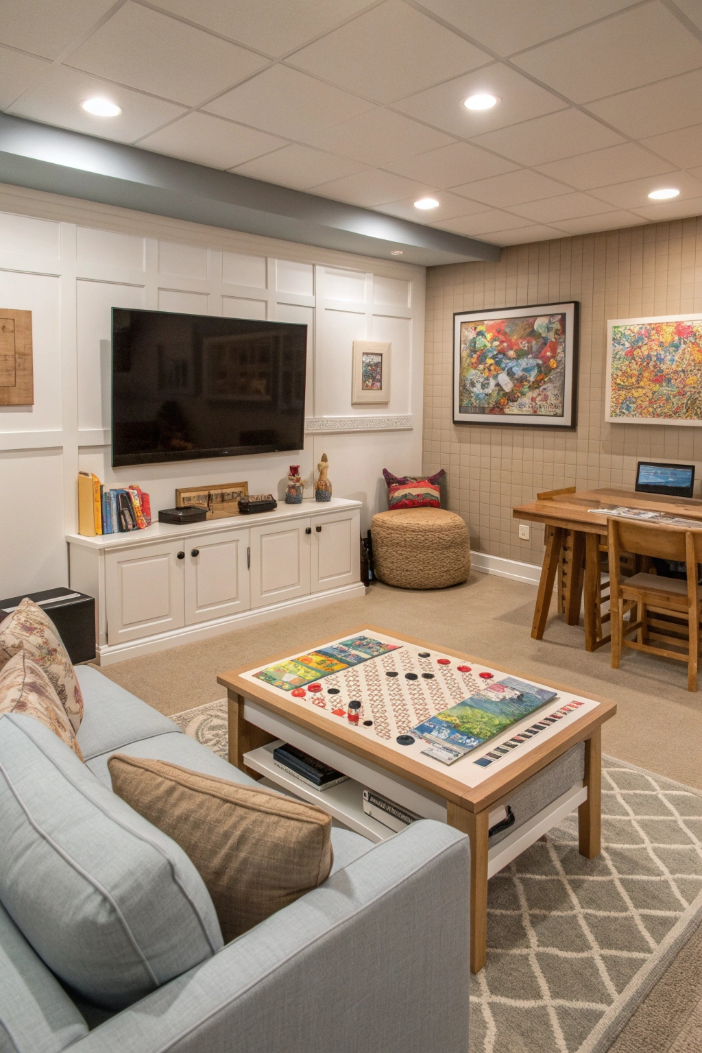 - A cozy board game corner with seating.