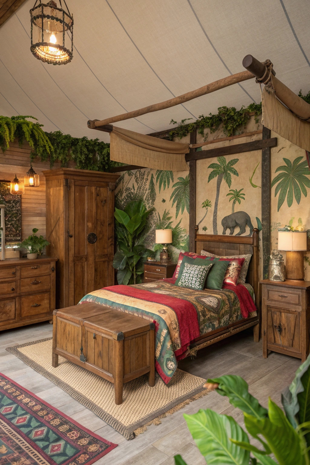 PinIf the Vintage Steampunk Style added a sense of nostalgia to your space, the Jungle Safari Lodge theme brings the vibrant spirit of adventure right into your bedroom. Consider using earthy tones, tropical patterns, and wooden furniture to create a warm ambiance. Add lush green plants and animal-themed decor for an immersive experience that transports you to the heart of the jungle.