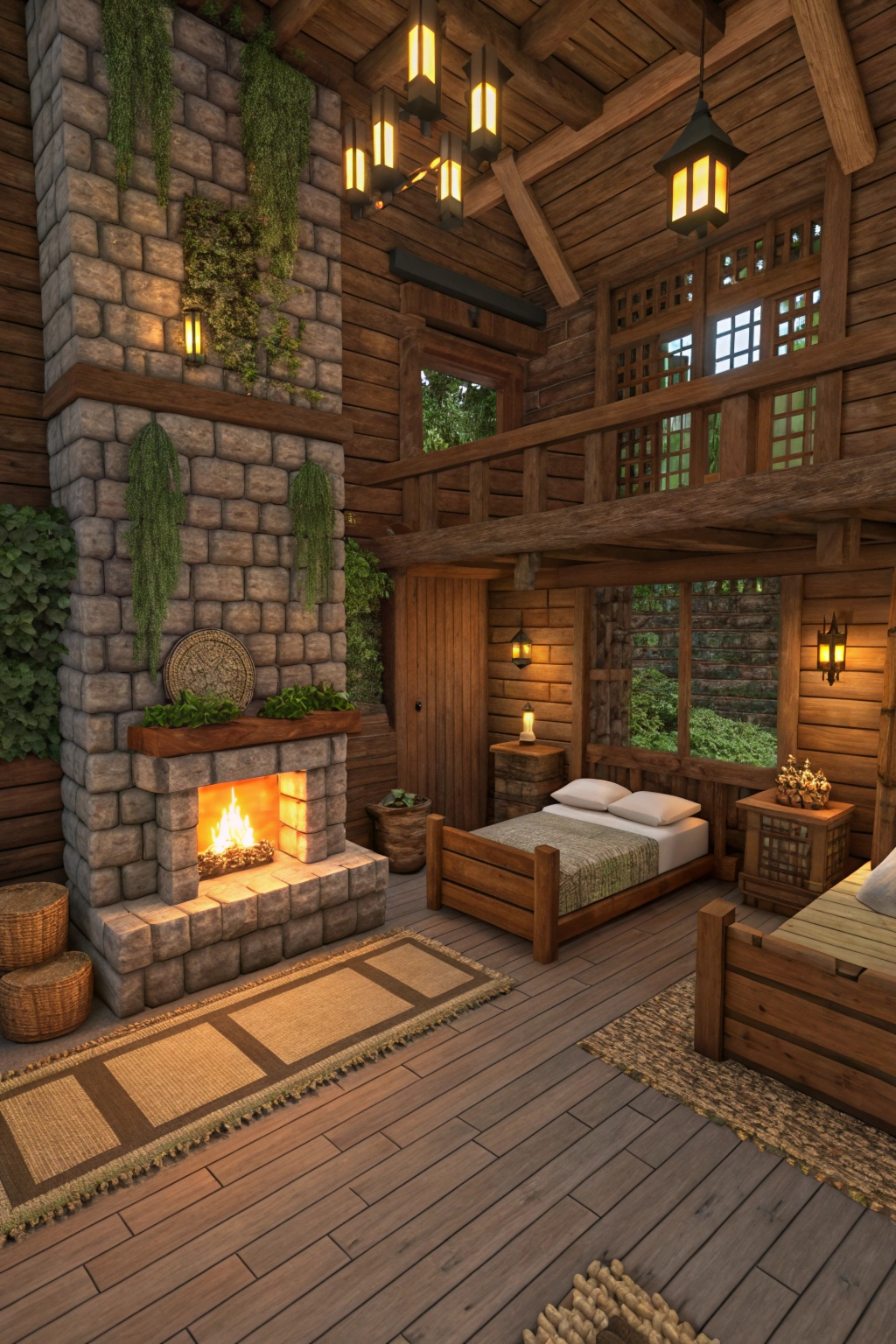 PinWhen it comes to designing a cozy retreat, embracing rustic cabin charm in Minecraft can transport you to a warm and inviting atmosphere. Use warm wood planks and stone bricks to create walls and flooring. Add a fireplace for ambiance, and include cozy furnishings like wool beds and hay bales. Don't forget to incorporate nature, using plants and lanterns to enhance that rustic feel.